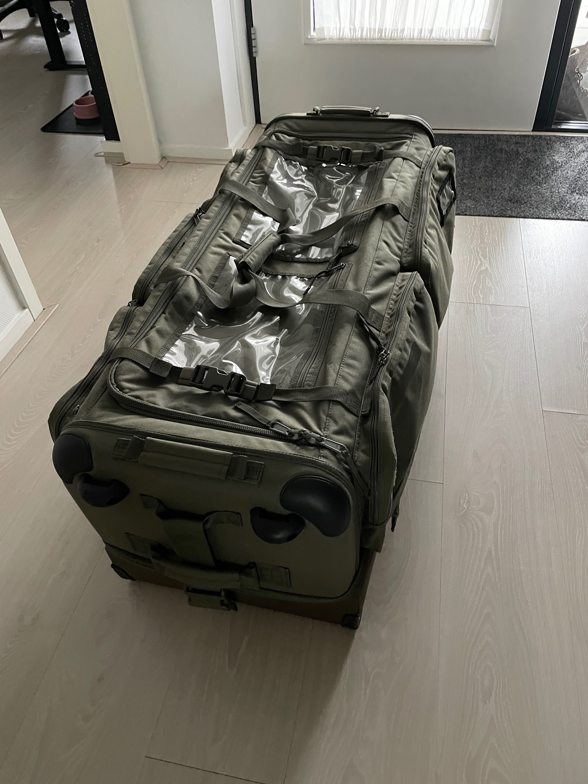Een maand oud. Geen beschadigingen of scheuren. Zeer goede tas voor airsoft spul en je kan letterlijk “al je shit meenemen”.
