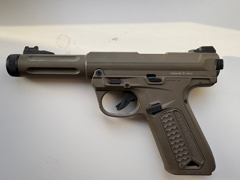 Alle externe onderdelen van het pistool zijn gemaakt van het bekende en bijzonder duurzame Action Army polymeercomposiet. Het gegroefde ontwerp van de loop met geïntegreerde groeven is bijzonder opvallend. Om de montage van een geluiddemper mogelijk te maken, is de loop voorzien van een 14 mm linksdraaiende schroefdraad. Schroef simpelweg de voorkap los en schroef een geluiddemper erop – zo eenvoudig is het. Voor nauwkeurig richten is de AAP-01 uitgerust met fiberoptische richtmiddelen aan zowel de voor- als achterkant. Het onderframe heeft een getextureerde grip, wat zorgt voor een zeer stevige houvast.