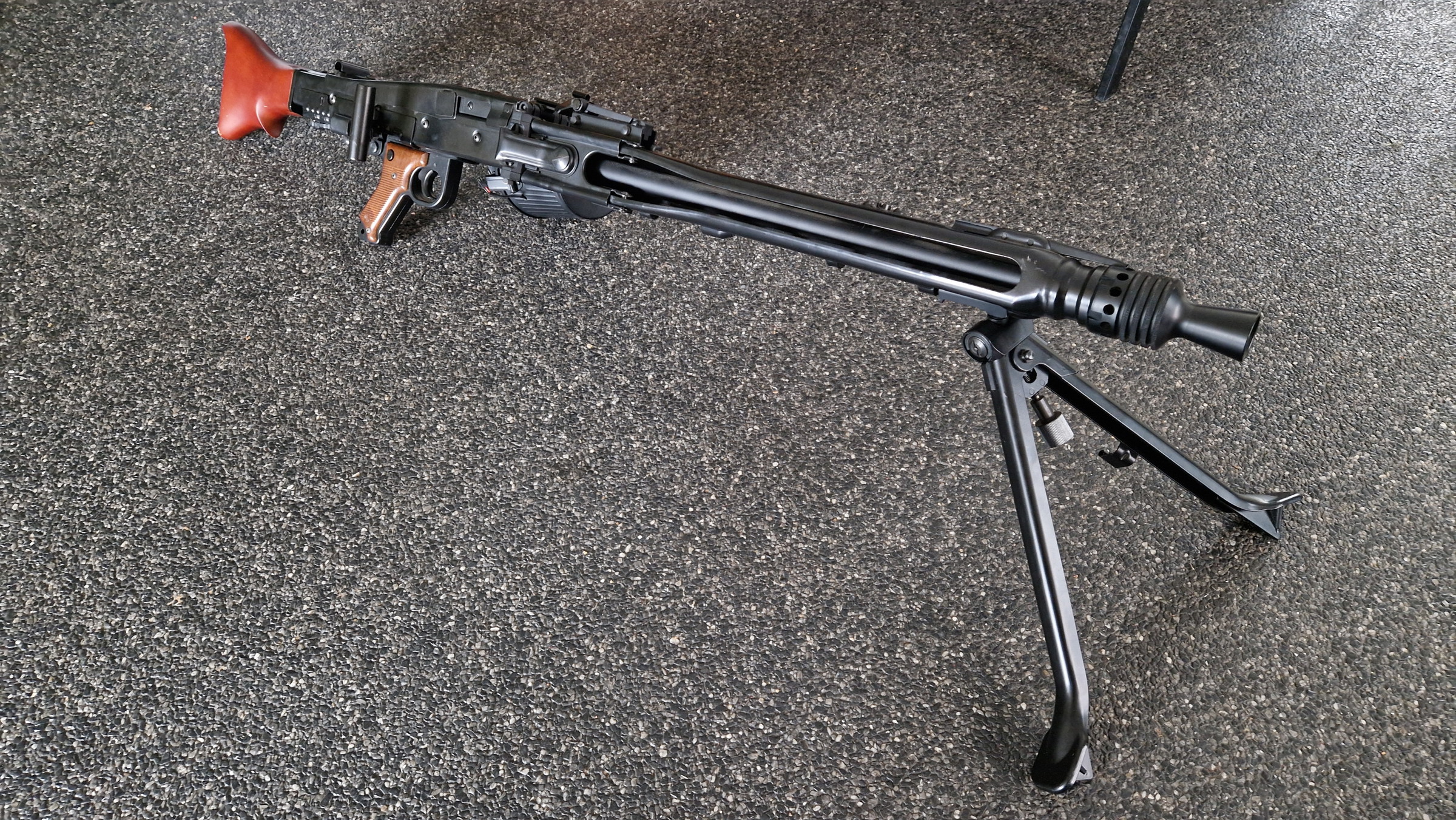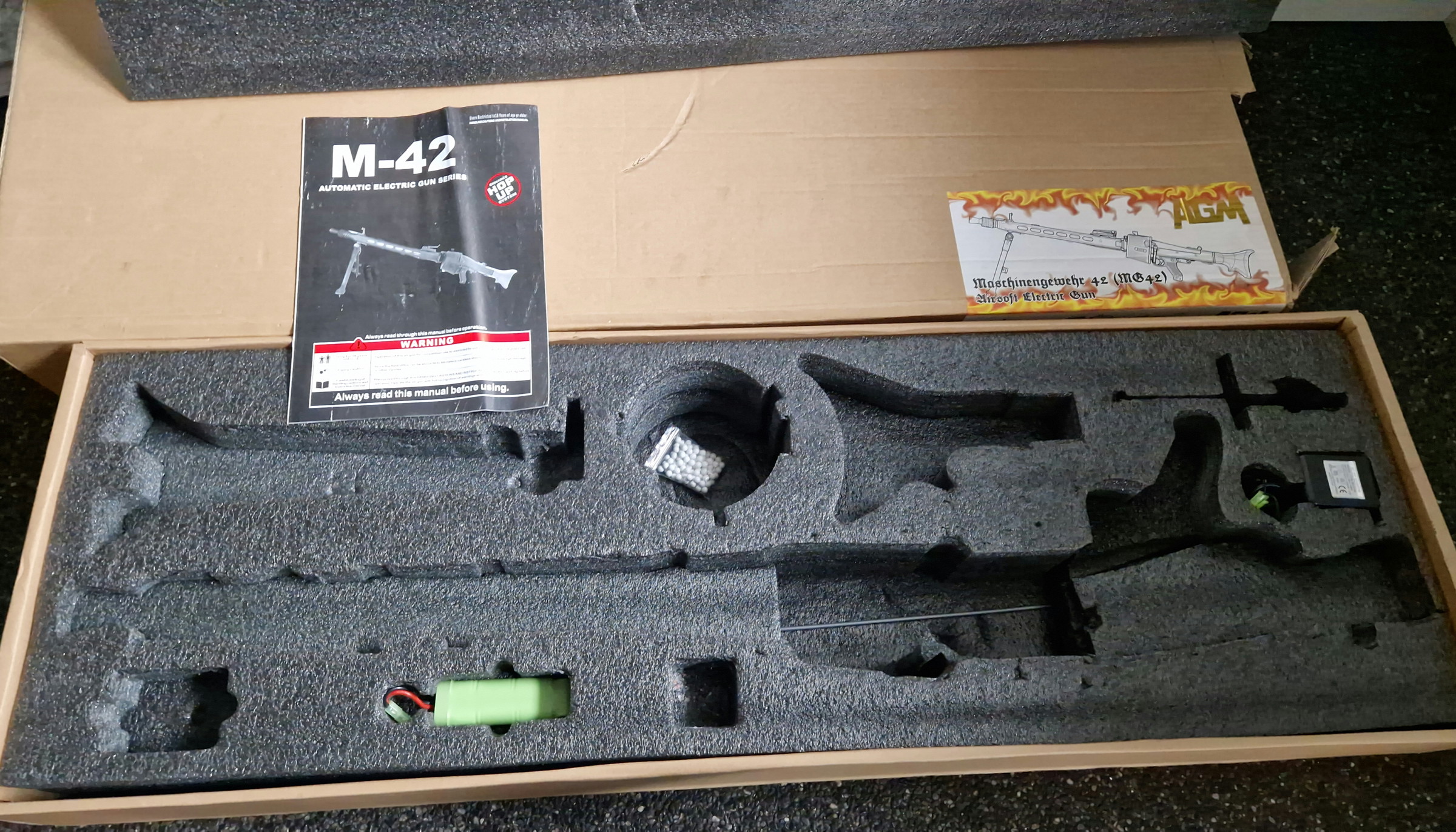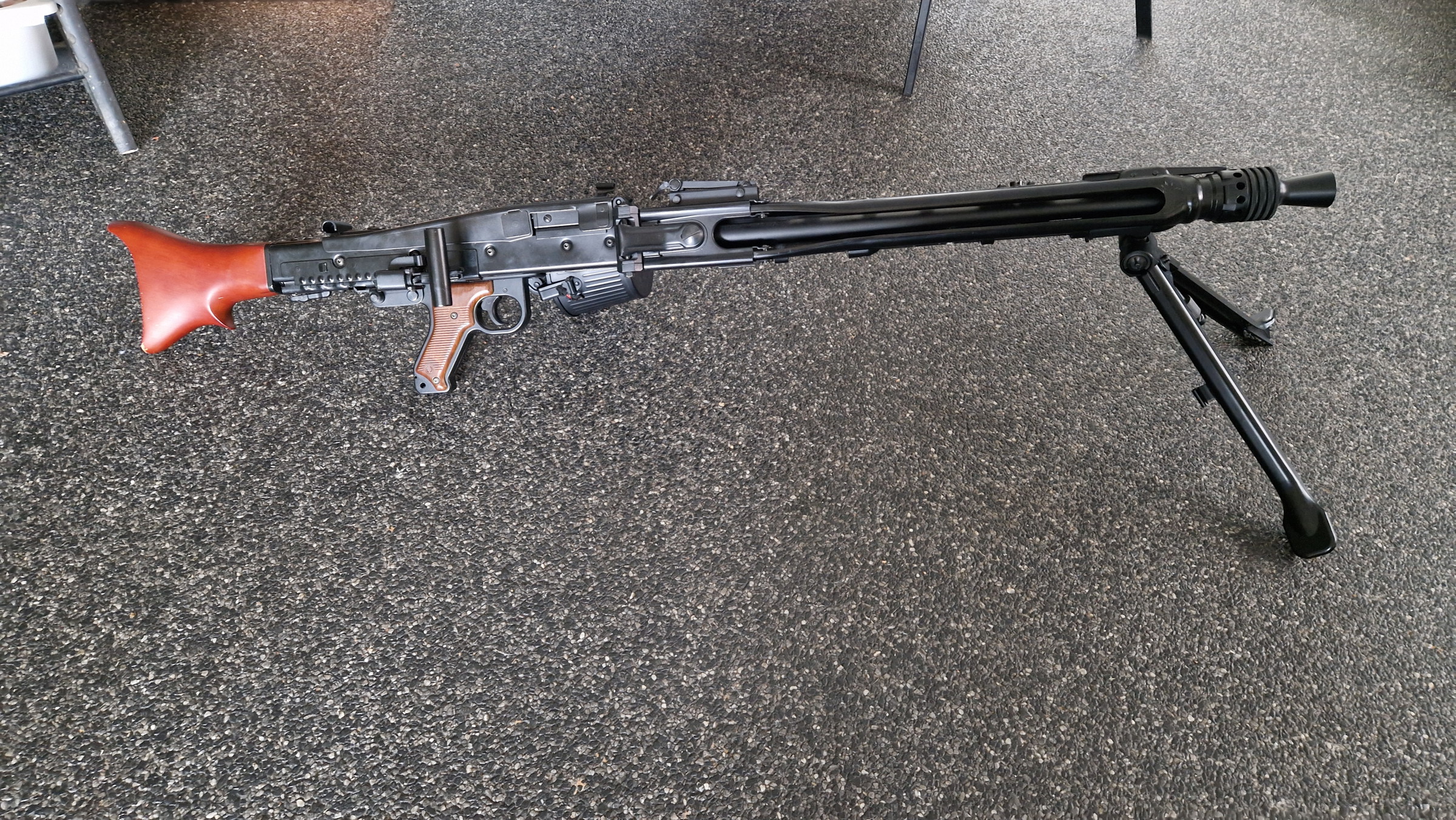 Bij deze aangeboden mijn MG42 in een zo goed als nieuw staat, hij is maar 15 minuten op 1 skirm gebruikt voor foto's en voor de rest heeft hij in de vitrinekast gehangen of thuis paar keer mee geschoten. De kolf heeft een lichte slijtage plek op de punt waar deze de grond raakt maar aangezien die van hout is is dat makelijk te herstellen. Er kan een 7.4v lipo bij geleverd worden.
