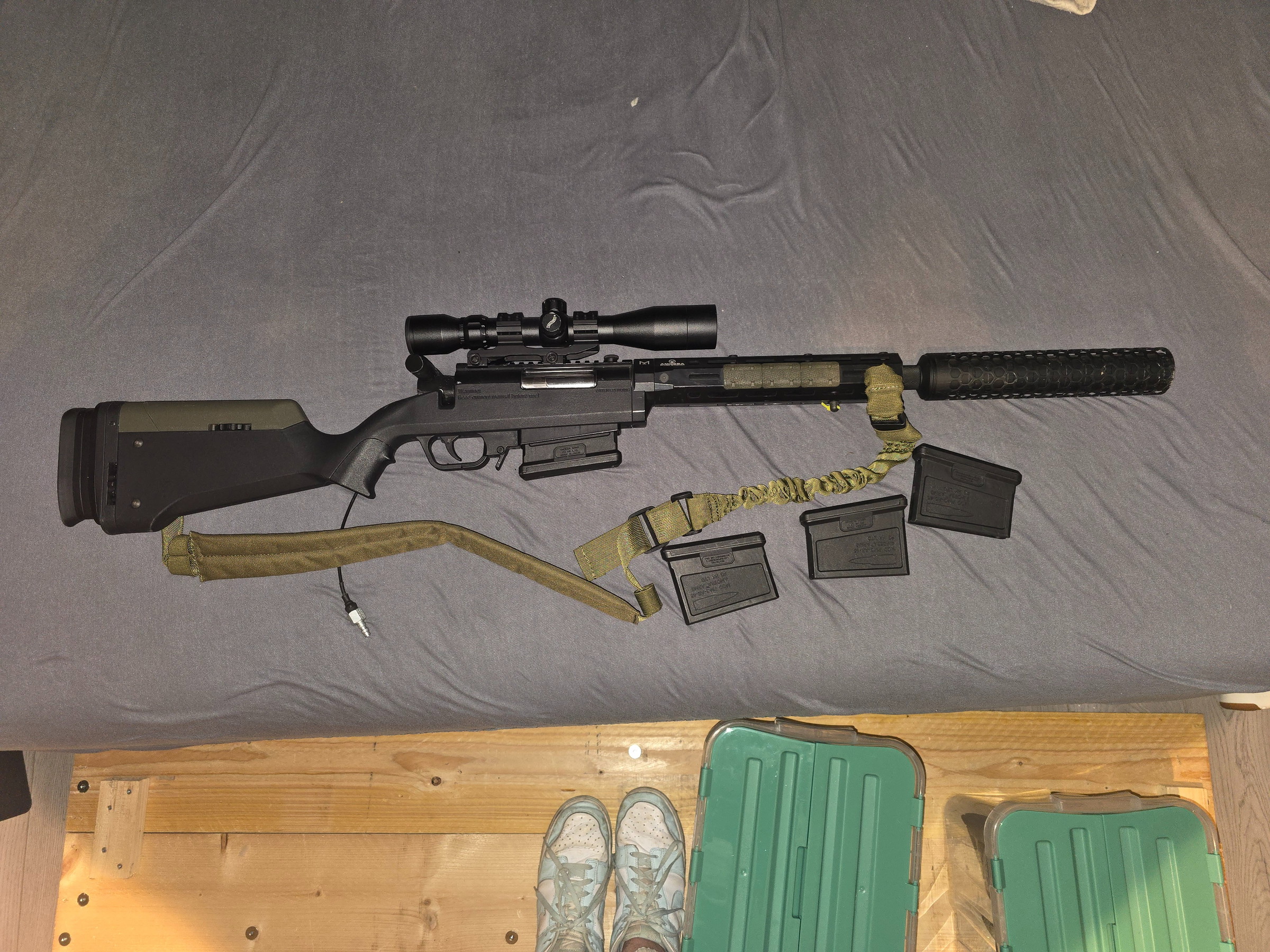 deze sniper komt met een mechanische hpa bolt en 4 magazijnen ook de scope em demper zitten erbij.