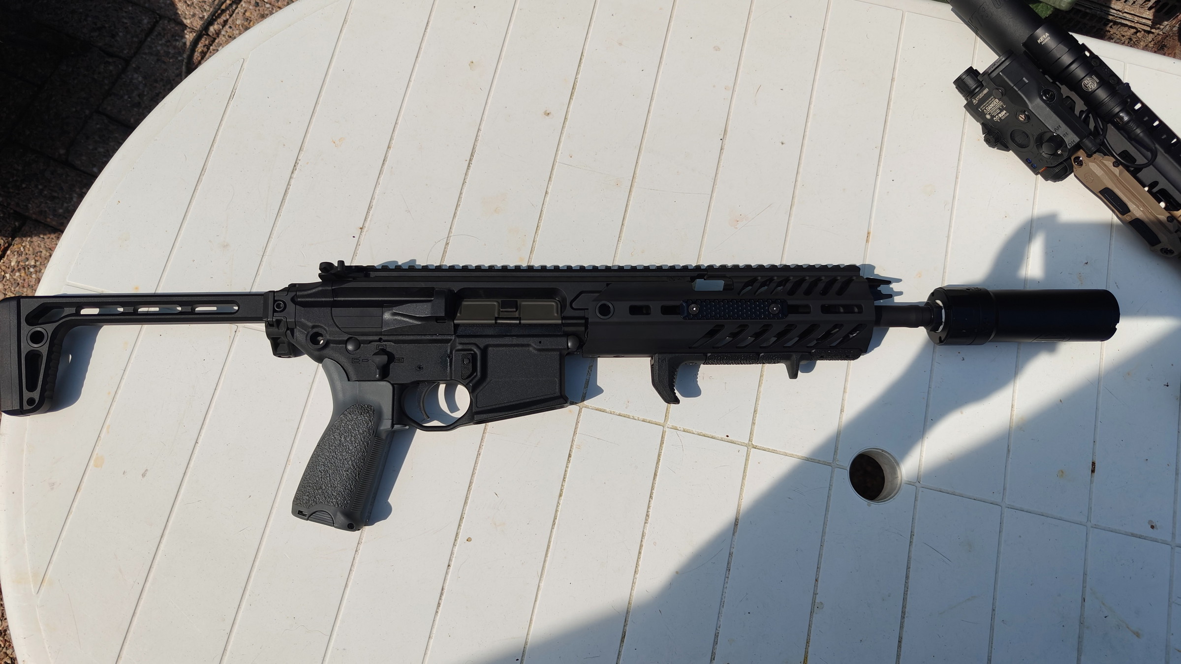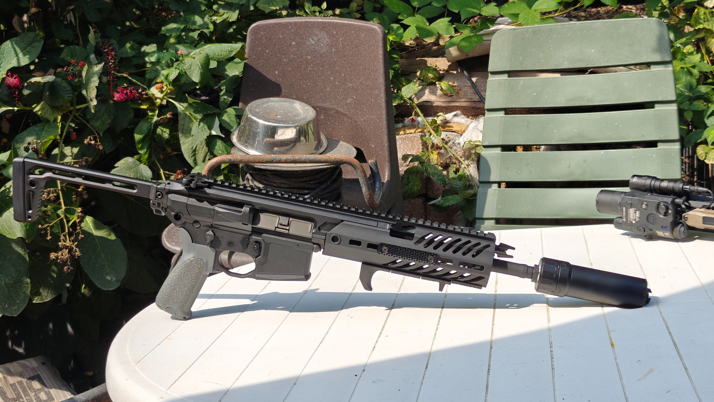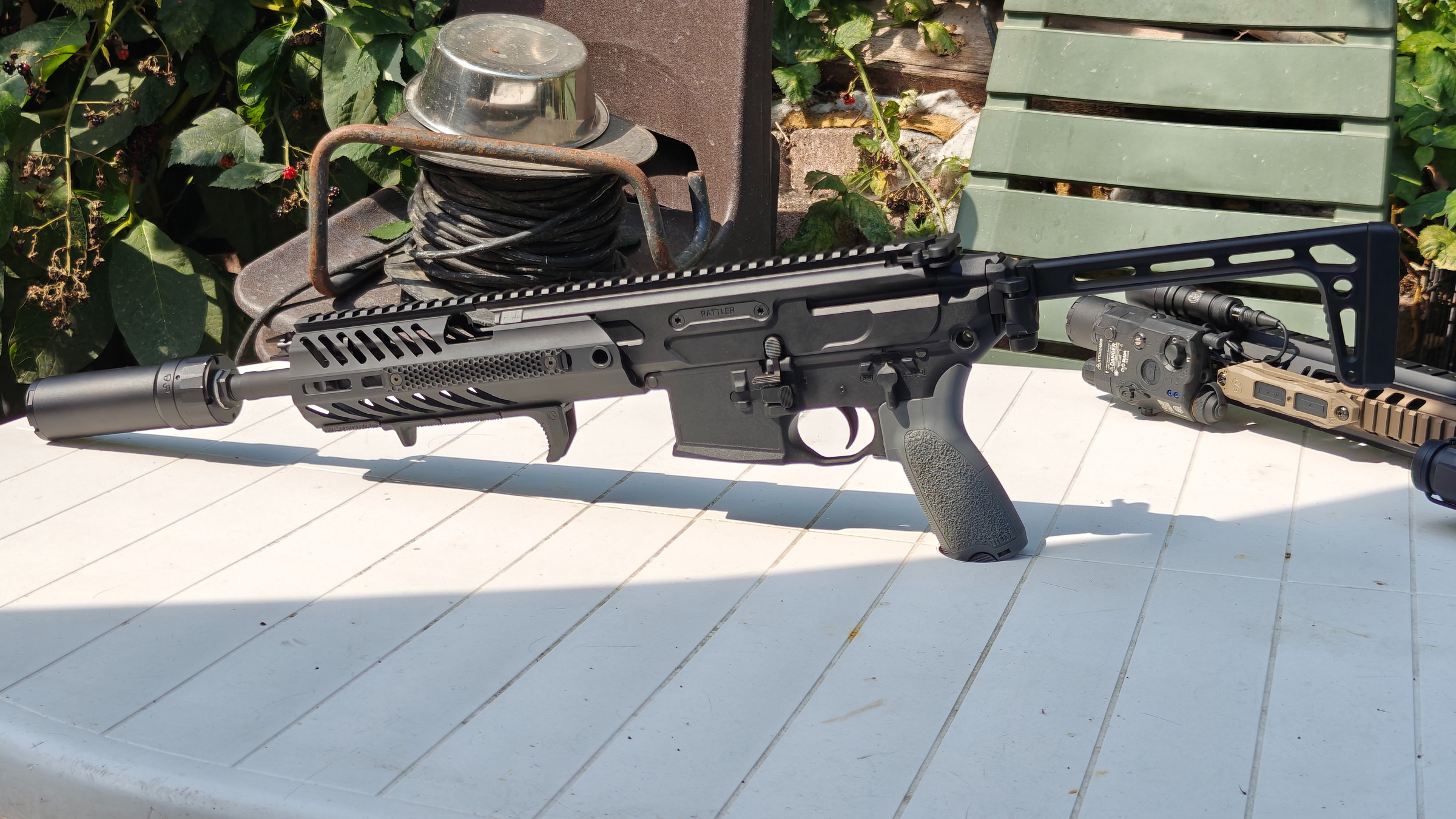 Handguard is vervangen door een SD Handguard van Airsoft Artisan, pistol grip is vervangen door een BCM grip.