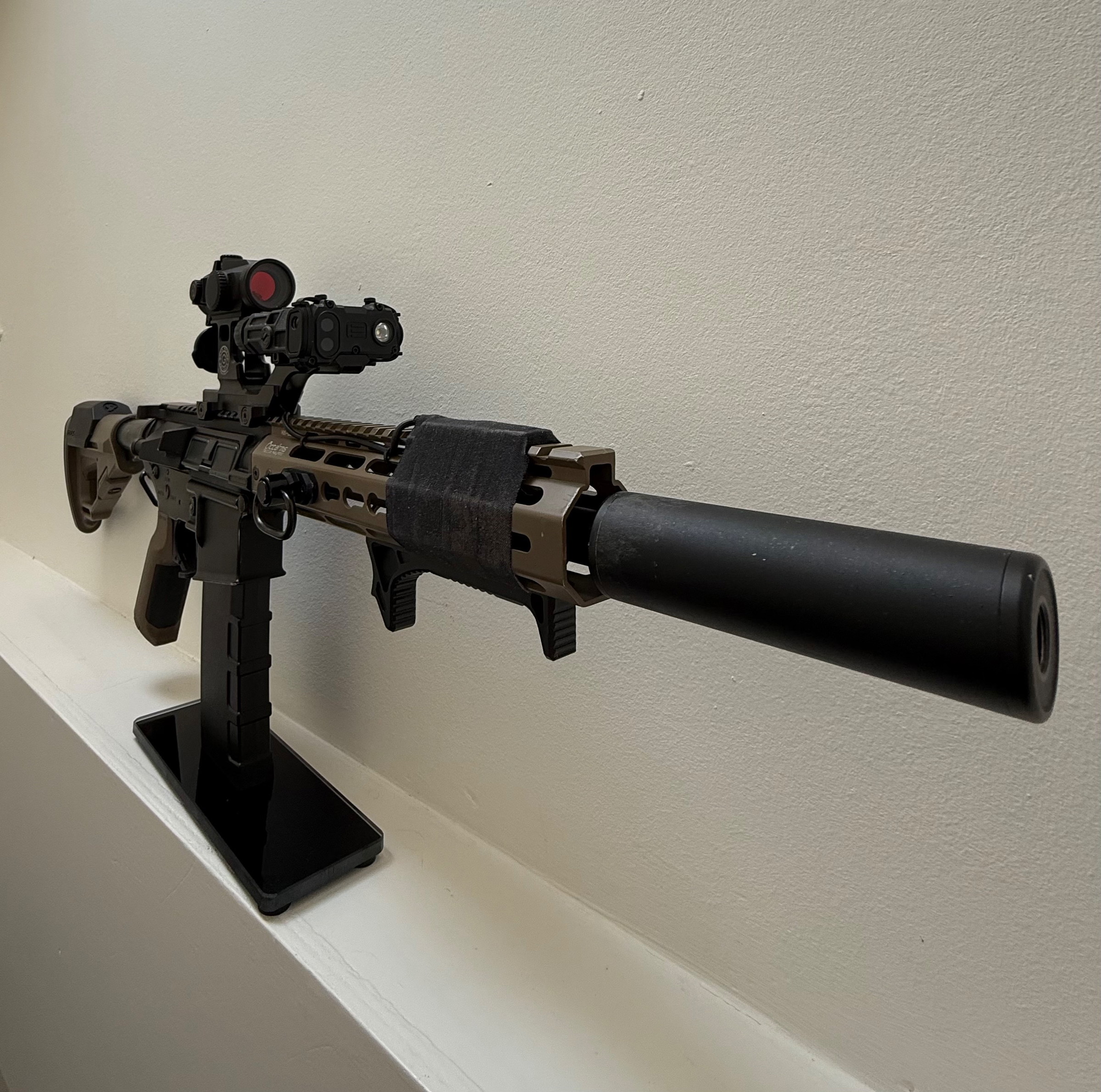 De replica heeft een verlengde inner barrel voor betere nauwkeurigheid en range. De demper zit erop zodat alles netjes afgewerkt is.