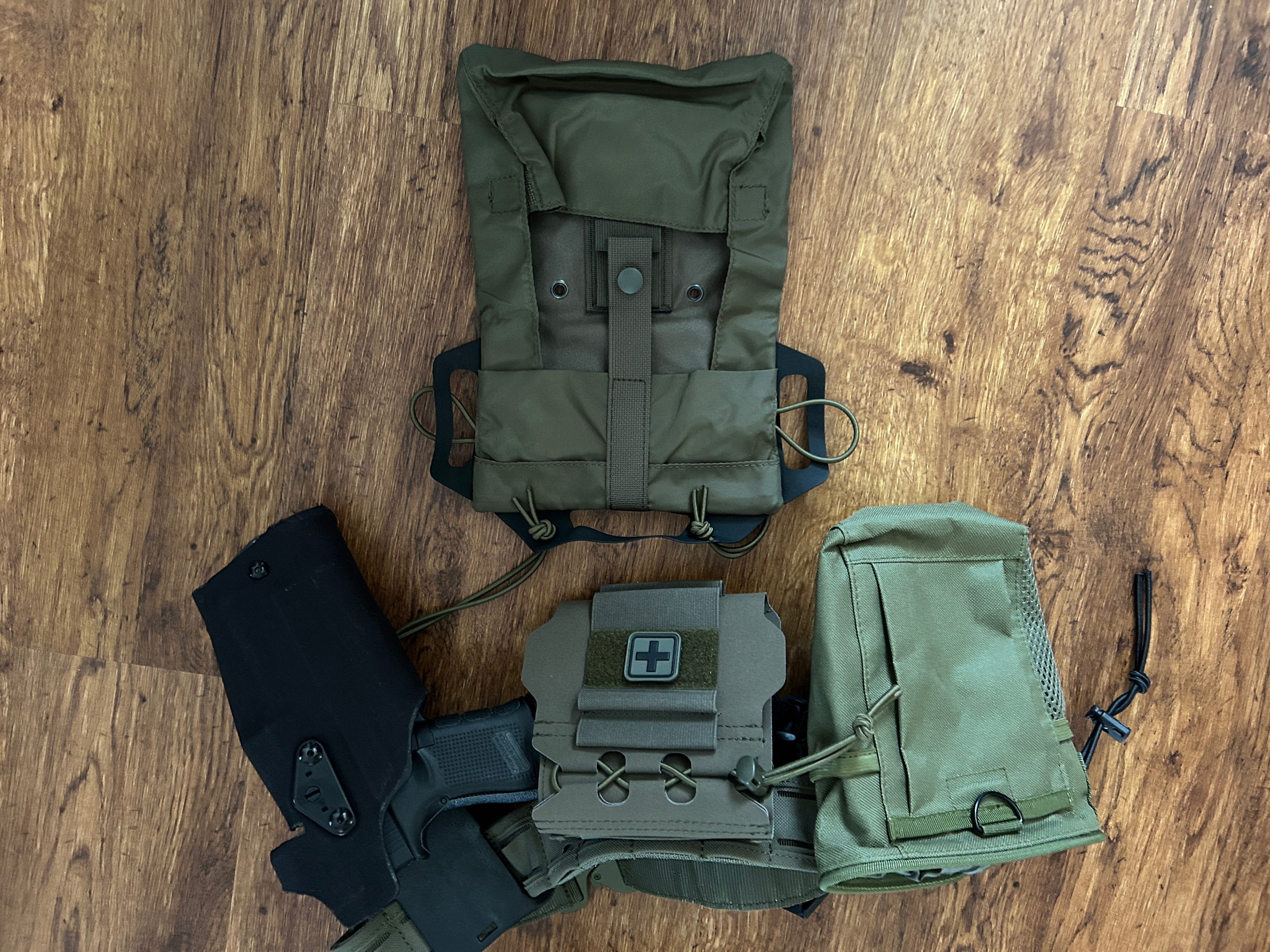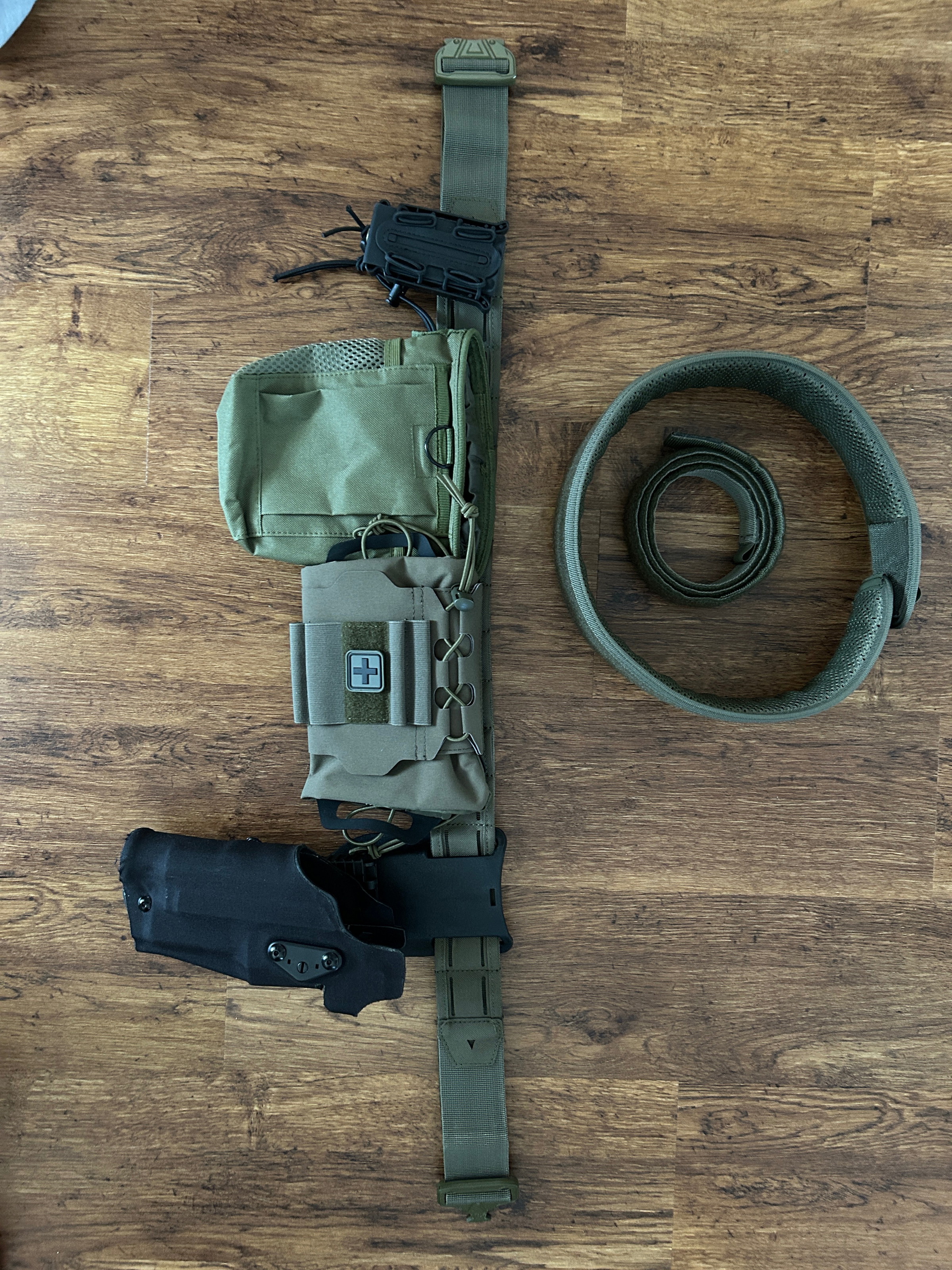 Battle belt with 9mm mag pouch, pouch for empty mags, first aid kit and holster for Glock 19.