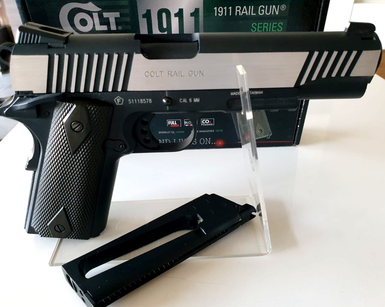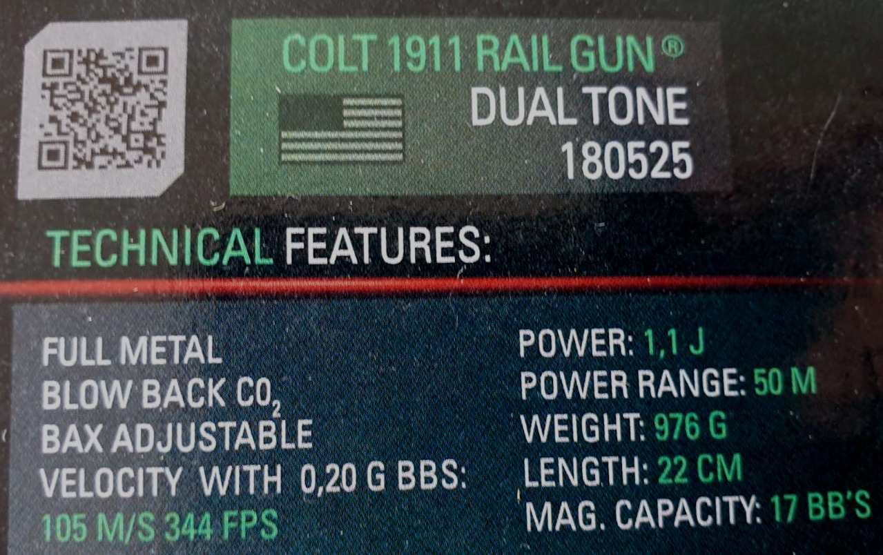 - Dit iconische pistool combineert meer dan 100 jaar geschiedenis met moderne upgrades. De Colt 1911 Rail Gun is perfect voor CQB-gevechten en veldspel, dankzij de betrouwbare CO2-aandrijving en realistische blowback. Het dual tone design geeft dit model een opvallende uitstraling die direct in het oog springt.