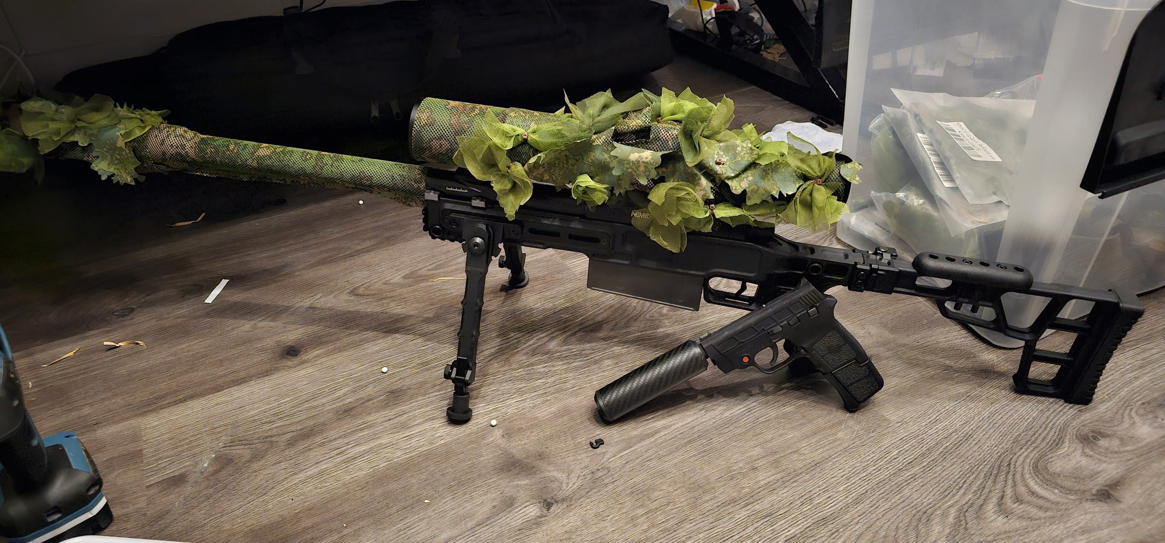 Sinds kort maak ik zelf mijn eigen ghillie covers voor over replicas, gopro's, scopecams, dempers, scopes noem maar op. Doordat ik zelf een naaimachine heb, meerdere lappen KMCS stof, leaves en mesh er bij heb kan ik zelf op elke maat covers maken.