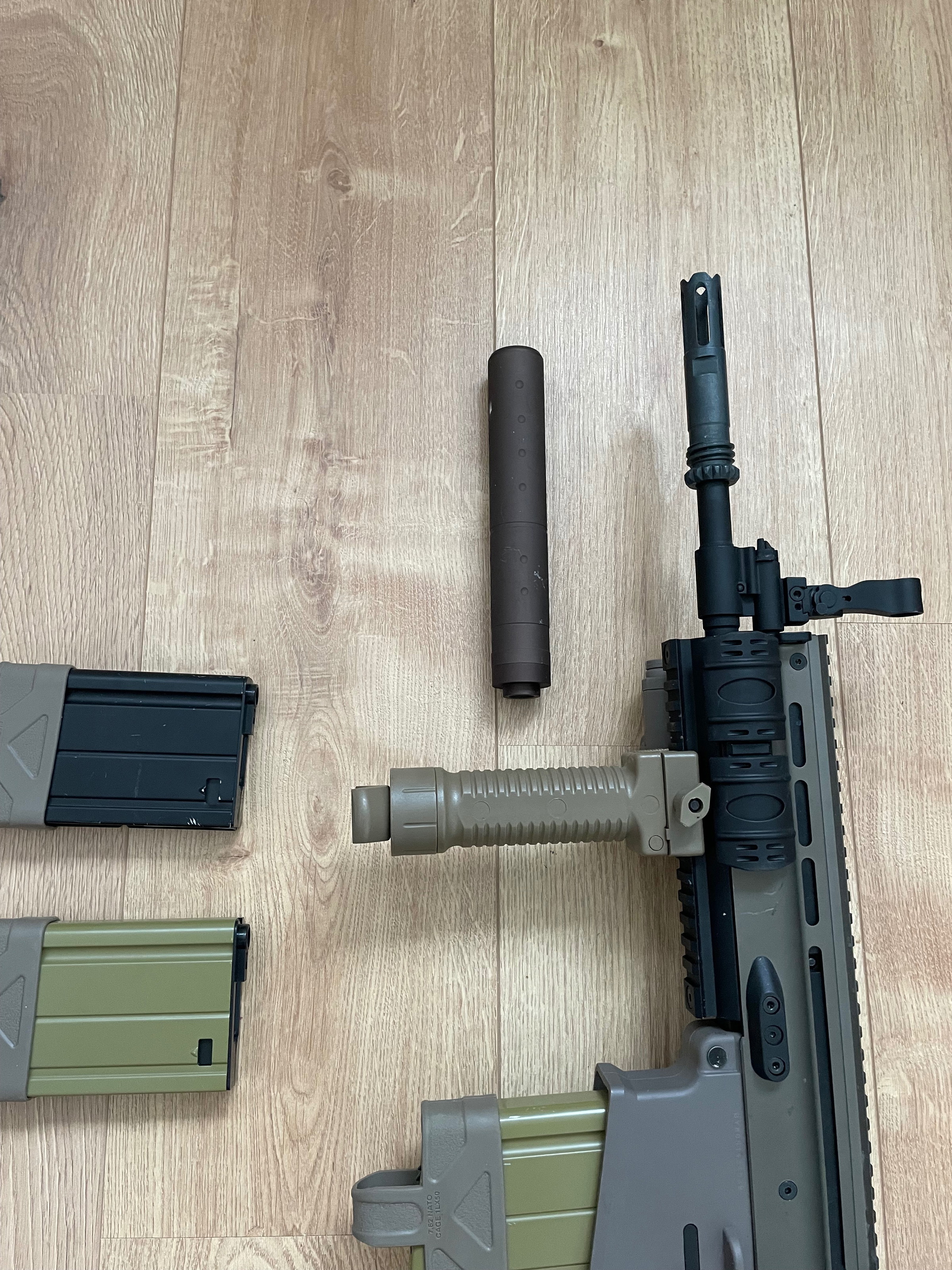 Dboys Scar H met 3 magazijnen, silencer, originele muzzle, neppe peqbox, grip als bipod. Airsoft systems mosfet ascu2 ingesteld op semi auto only. Schiet 1.82 met 0.30. Heb er evt andere veren bij. Schiet mooi ver, strak. Kan hier getest worden, ophalen heeft de voorkeur.