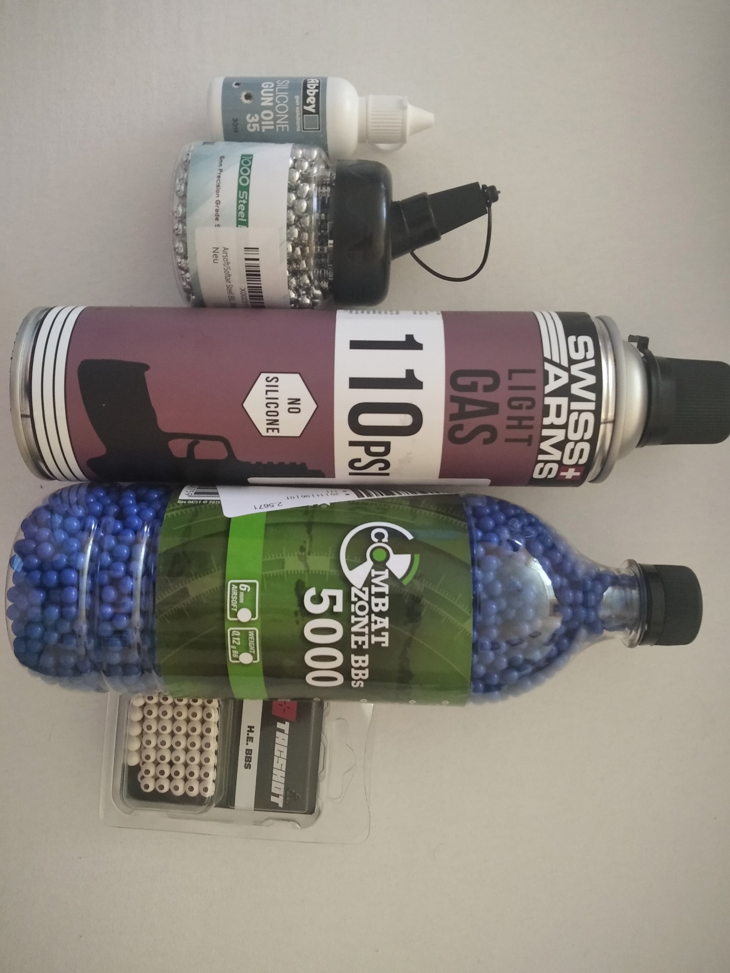 6mm Kugeln ca. 5000stk. Plastik in Blau und Stahlkugeln  ca. 900 stk.  Öl für die Pistole sowie ca. 80 Knall💥 und Effekt Patronen die beim aufprallen Funken sprühen. Werden auch für Filmaufnahmen benutzt.