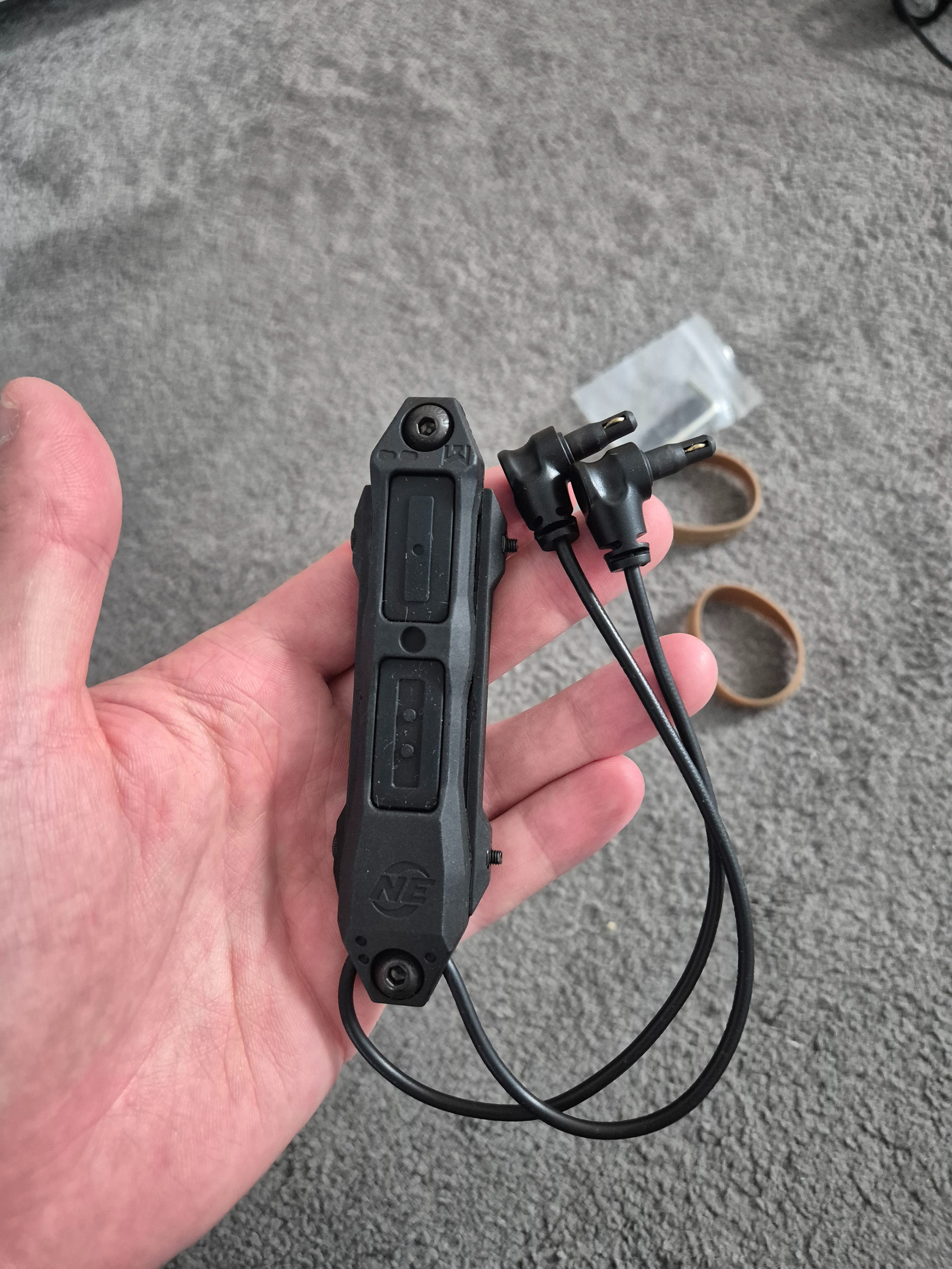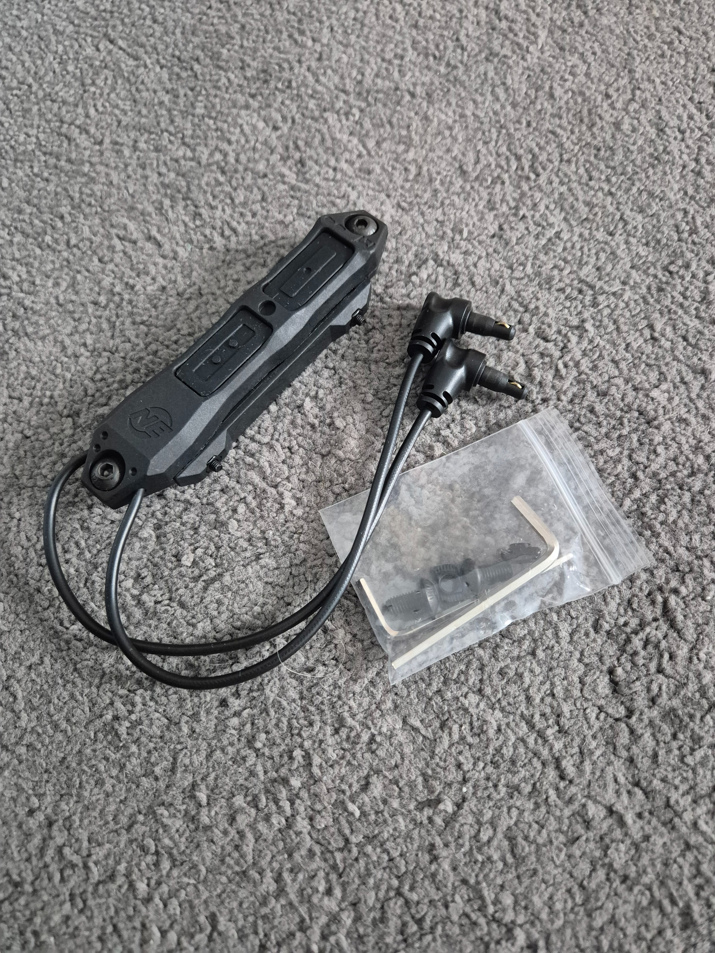 Dual crane plug pressure switch. Kan op rail of mlok bevestigd worden. Bedoeld voor MAWL-C1 laser maar kan ook op andere lampen of lasers met crane plug geplaatst worden. Nieuw in verpakking. 10 euro