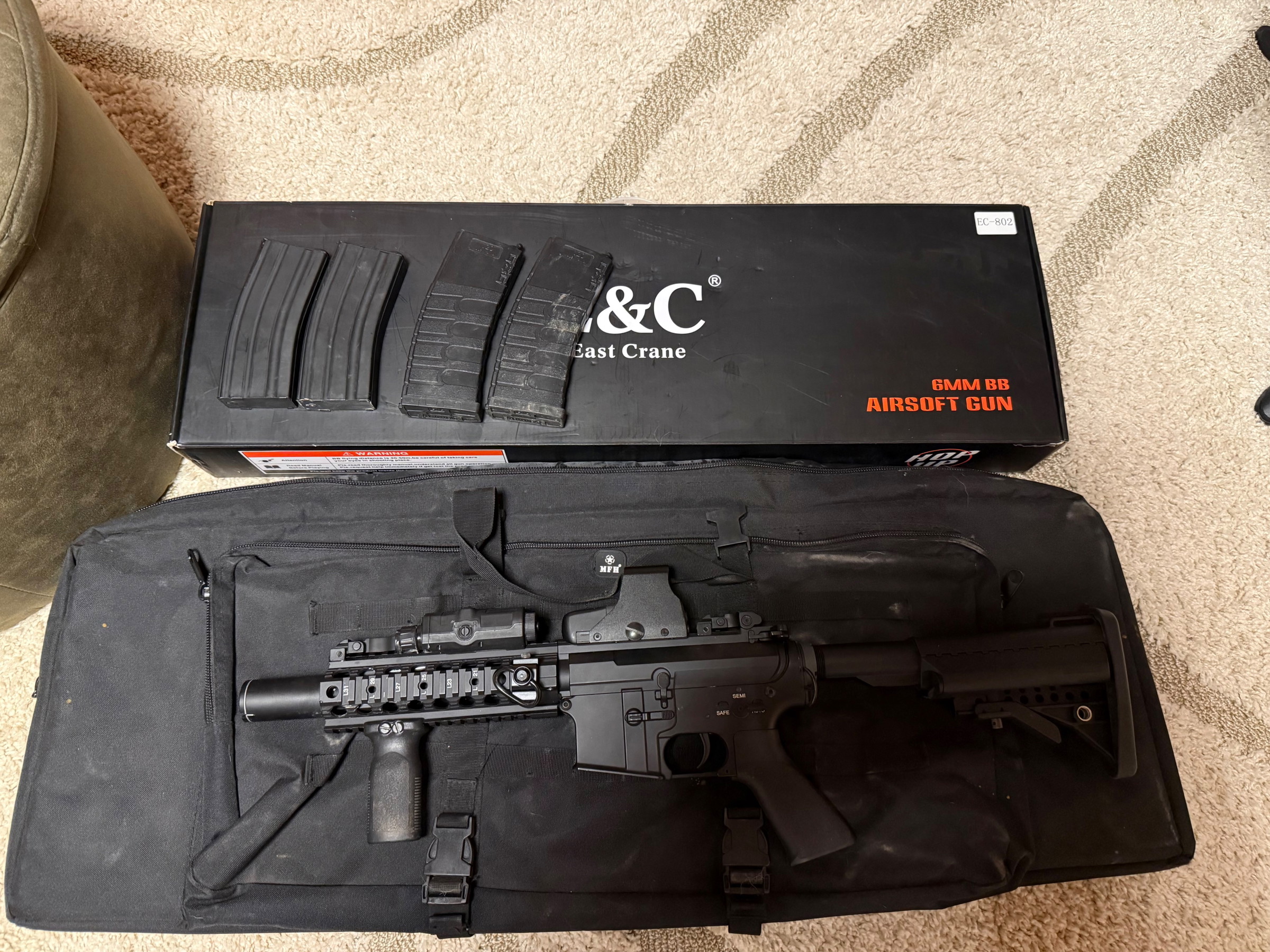 Lieferumfang: Waffe + montiertes Zubehör , 4 Magazine, Tasche.