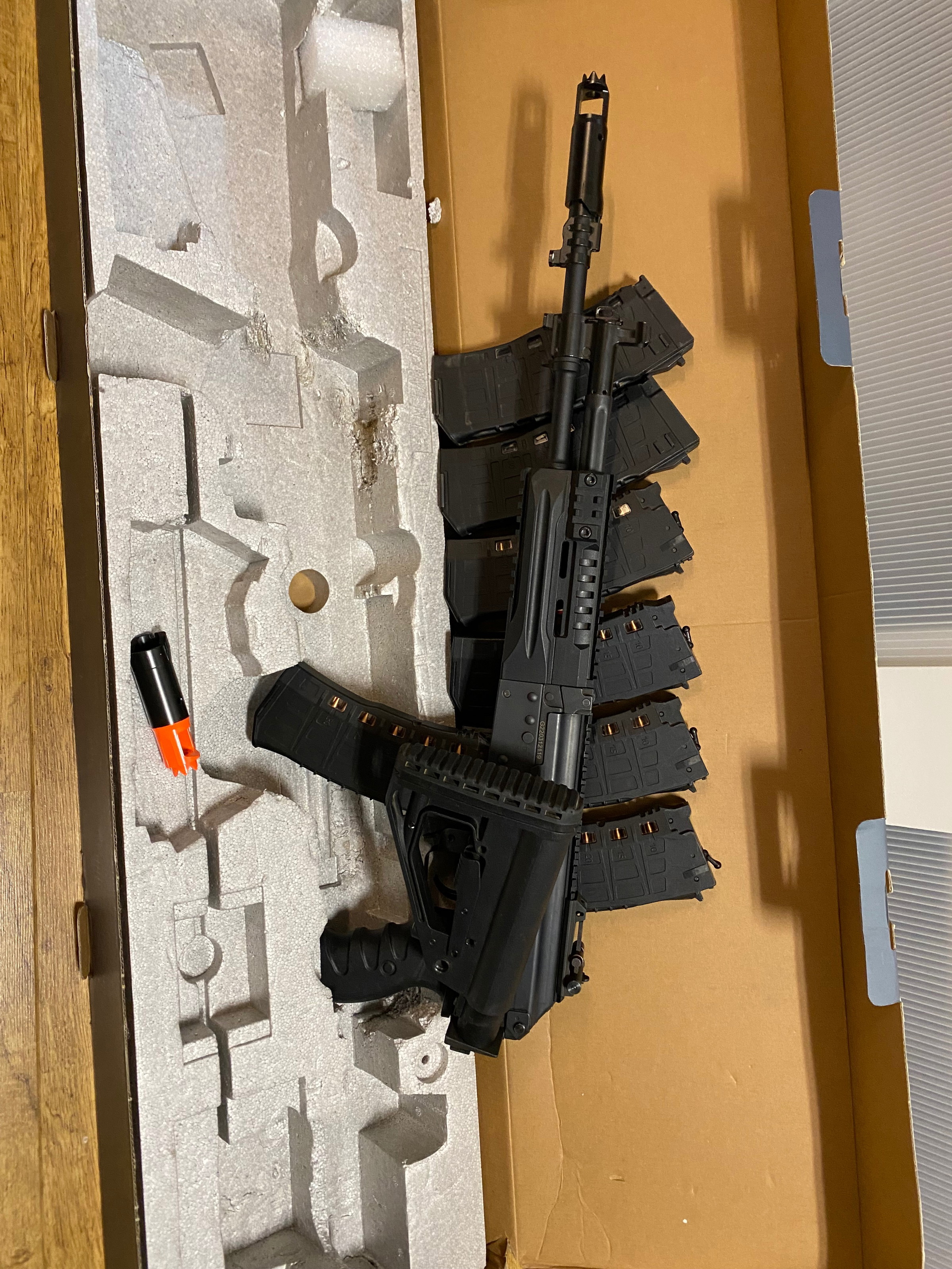Het bovenste gedeelte van de handguard is eenvoudig af te nemen om bij het batterijcompartiment te komen. Er zit een grote AK-stijl fire selector aan de rechterzijde van de behuizing, waarmee je kunt schakelen tussen de burstmode, de semiautomatische vuurstand en de volautomatische vuurstand. Door de charging handle naar achteren te trekken open je de ejector en kun je bij de verstelbare hop-up komen. Hierdoor heb je controle over het zuivere bereik van deze G&G GK12 airsoftreplica. Hij wordt geleverd met een polymeer magazijn met een capaciteit van 120 BB’s. Dankzij de extra ver uitstekende follower ben je er van verzekerd dat elke BB wordt benut.