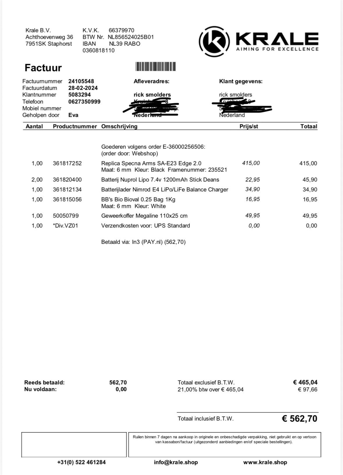 hierbij verkoop ik mijn specna arms SA-E23 edge 2.0 incl koffer, 2x batterij, batterij lader en 1kg bbs bio bioval 0.25. Gekocht op 28-2-2024 echter nooit gebruikt omdat vrienden vrij snel naar aanschaf equipment zijn gestopt vandaar altijd in de koffer bewaard en nooit gebruikt. factuur aanwezig