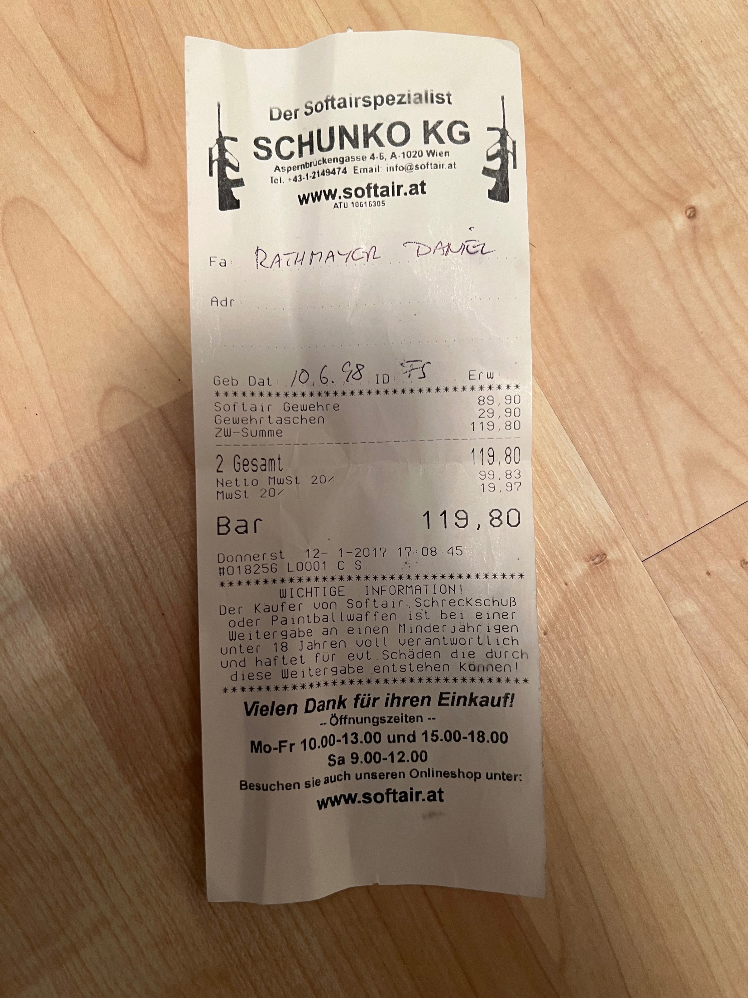 • Rechnung vom ursprünglichen Verkäufer (Schuko KG, Wien) für Waffe + Tasche vorhanden (originalpreis: Waffe €89,90; Tasche €29,90 → Gesamt €119,80). Sonstiges Zubehör ohne Rechnung.