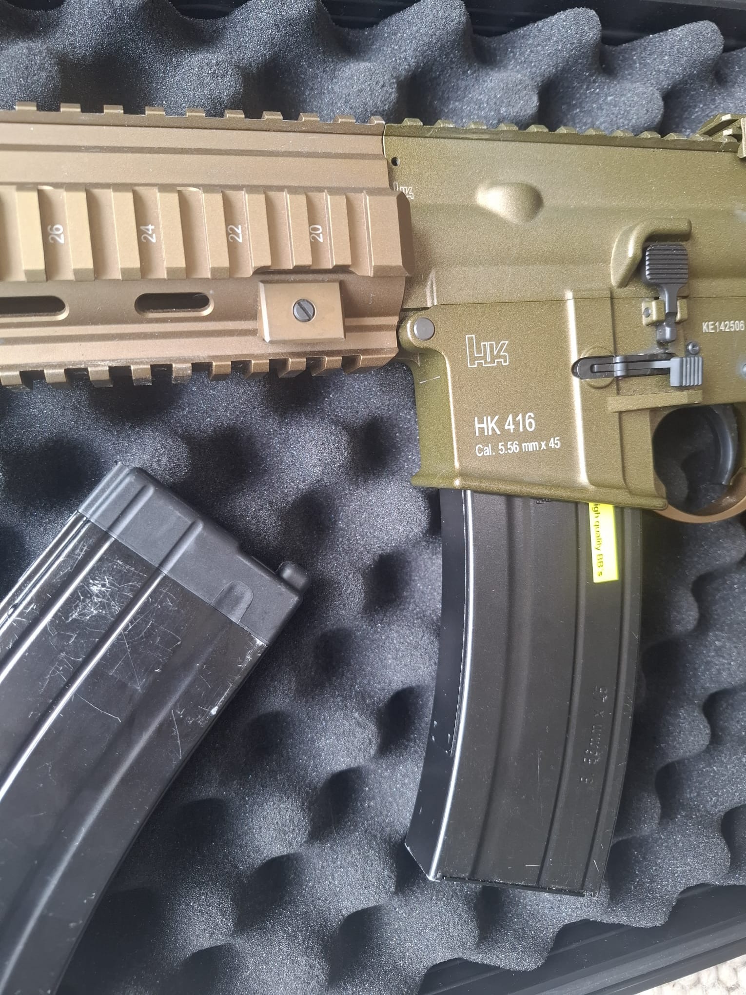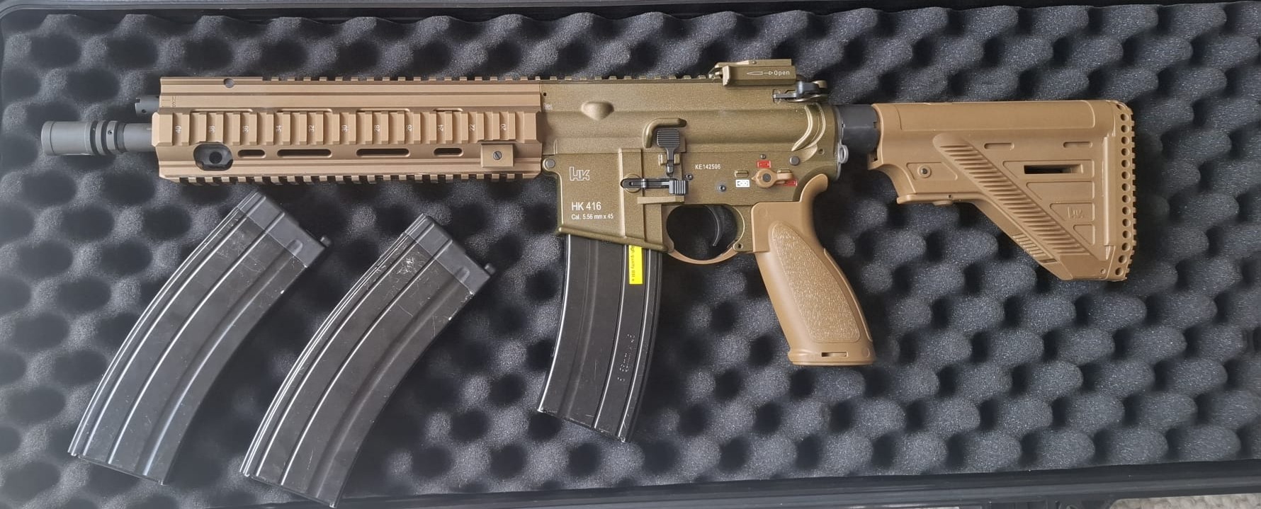 - HK 416 GBB RAL8000 – Het iconische Duitse model met een echte blowback actie voor een authentieke schietervaring.
