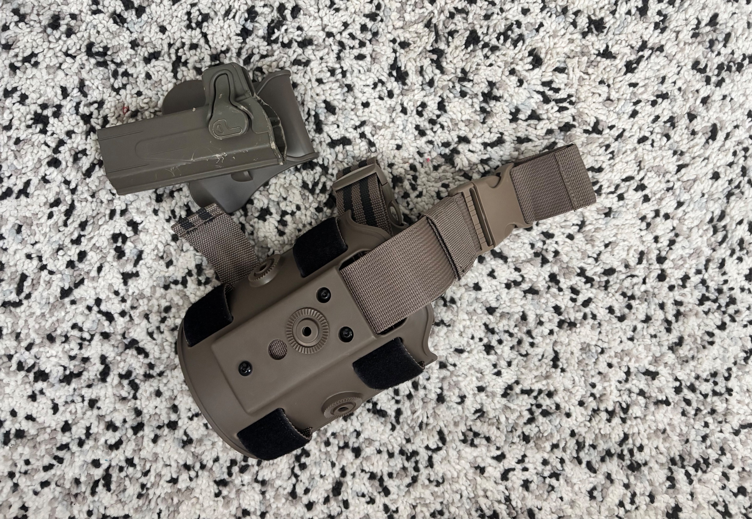 Het holster is regelmatig gebruikt en vertoont lichte gebruikssporen, maar is nog steeds volledig functioneel — houdt de replica stevig vast en klikt goed vast in de vergrendeling.