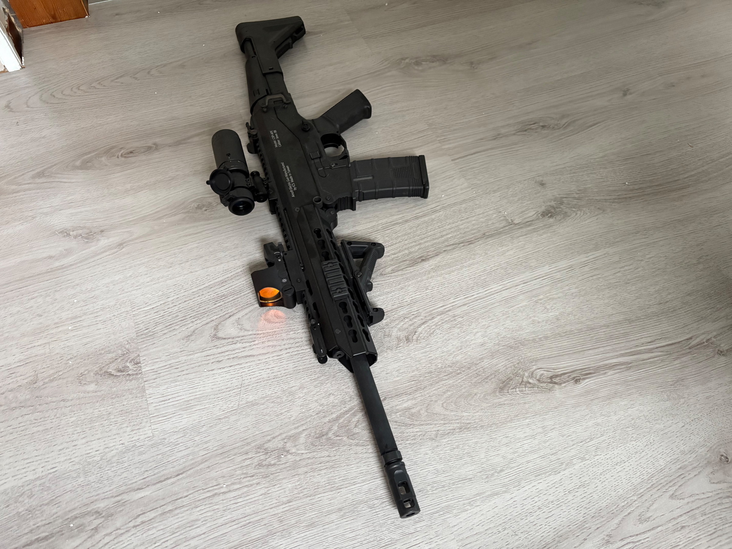 Auf der Waffe ist ein abgewinkelter Griff verbaut und ein Holo Visier mit Vergrößerung von Ferrichi verbaut (Neupreis 160€). Dieses kann gegen 100 Euro Aufpreis dazu erworben werden. Die restlichen Teile geb ich einfach dabei.