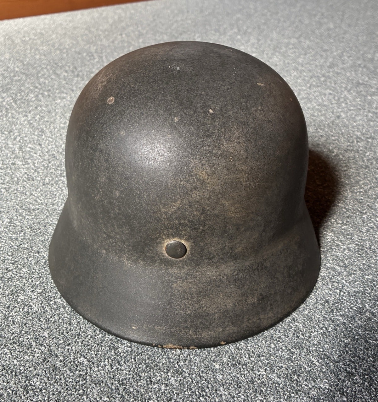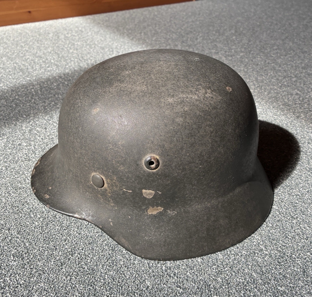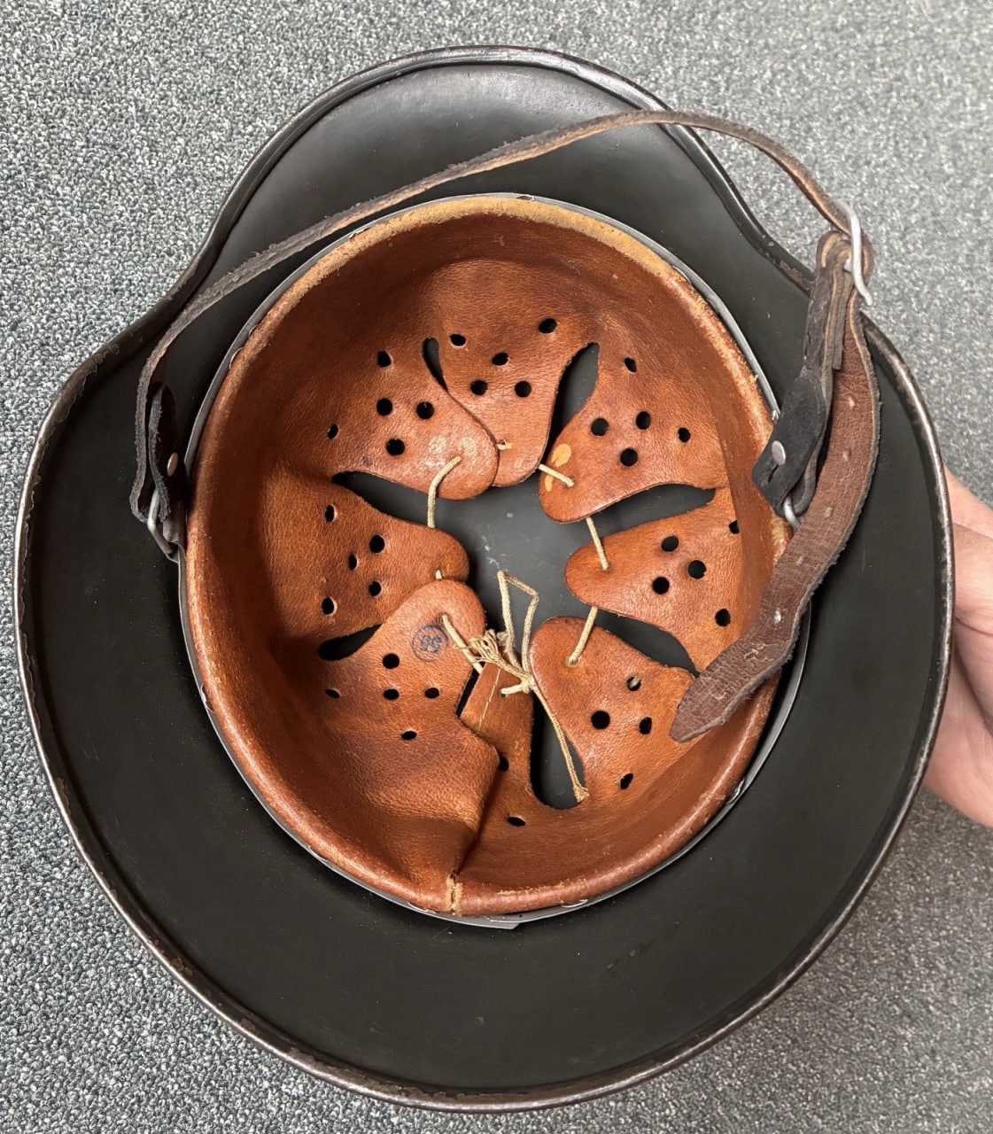 M35 Stahlhelm der Wehrmacht. In allen Teilen original. Der Helm wurde während des Krieges überholt. Sprich, es kam ein Innenfutter mit Zinkring rein und der Helm wurde mit nicht reflektierender Farbe lackiert. Dies ist vor 1945 geschehen und war gängige Praxis während des Krieges. Dabei wurden beide Abzeichen überdeckt. Diese sind unter der Feldfarbe vorhanden. Das Zink-Innenfutter ist von B&C von 1943. Das Innenfutter ist komplett original! Das Leder des Futters und des Kinnriemens ist weich. Splinte sind ungeöffnet.