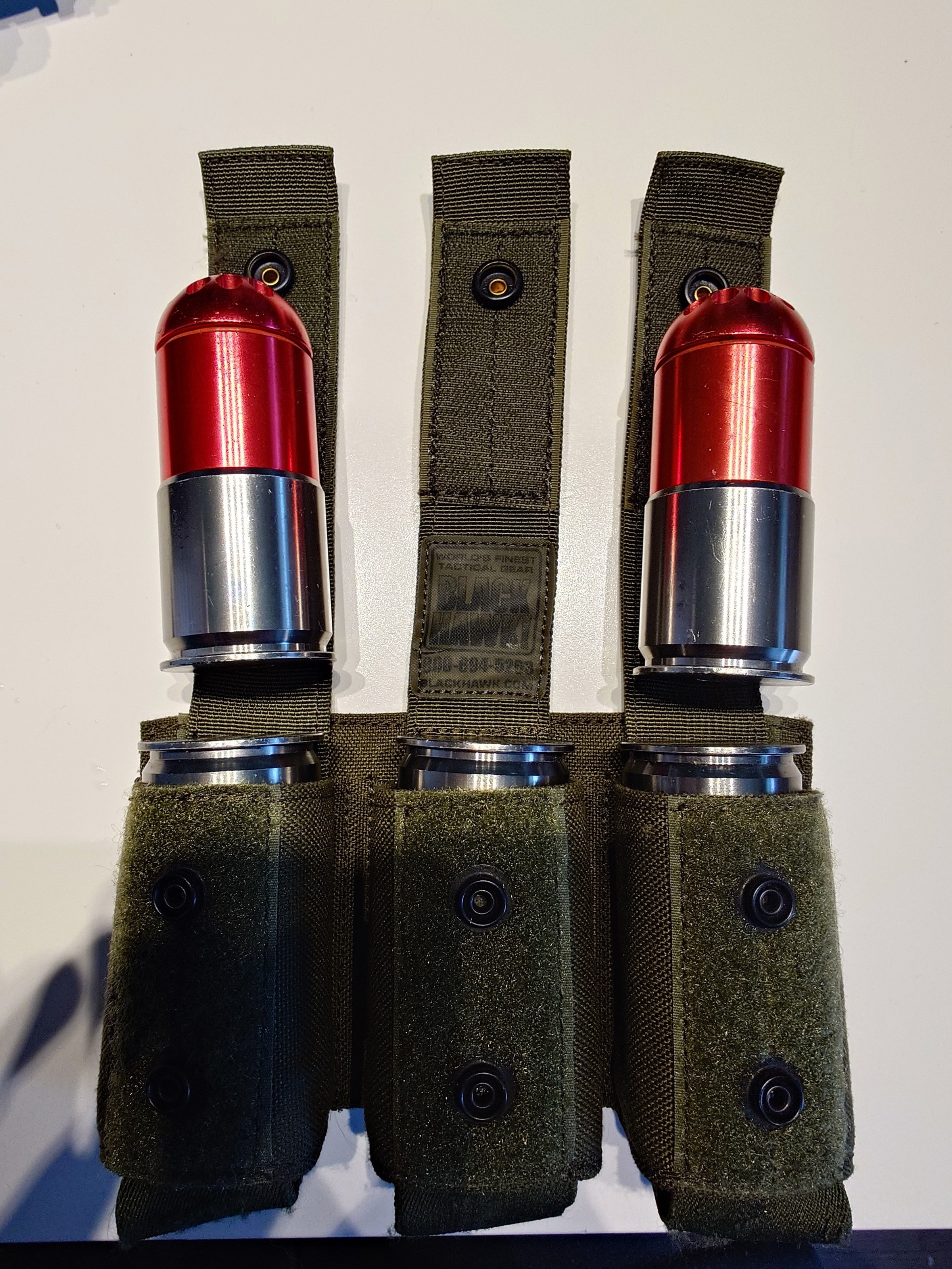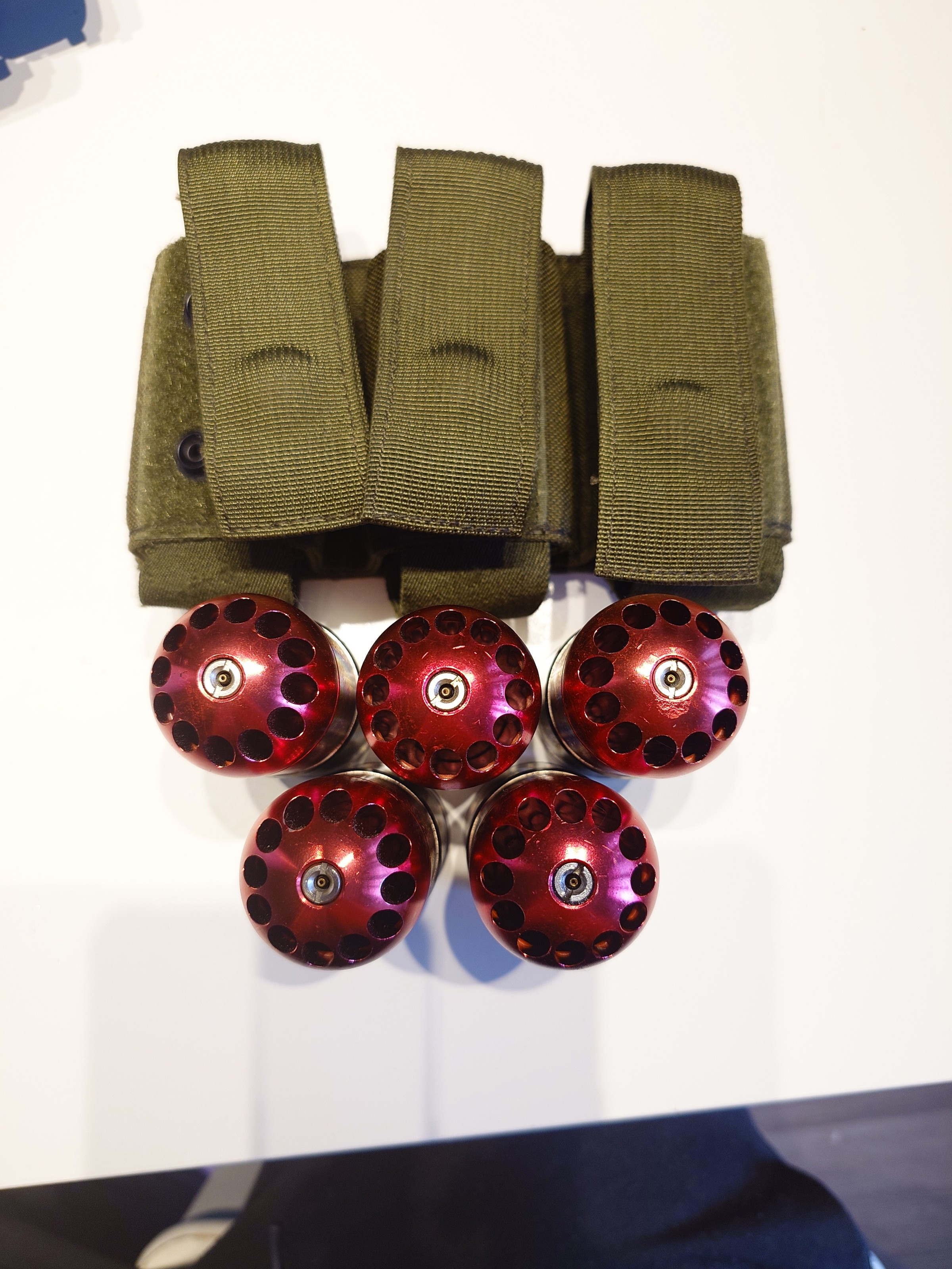 5 grenades, all gastight. 1 Blackhawk pocket for 3 40mm grenades. Works perfectly fine with CO2 *Admin: link deleted*Asking 240€ + shipping