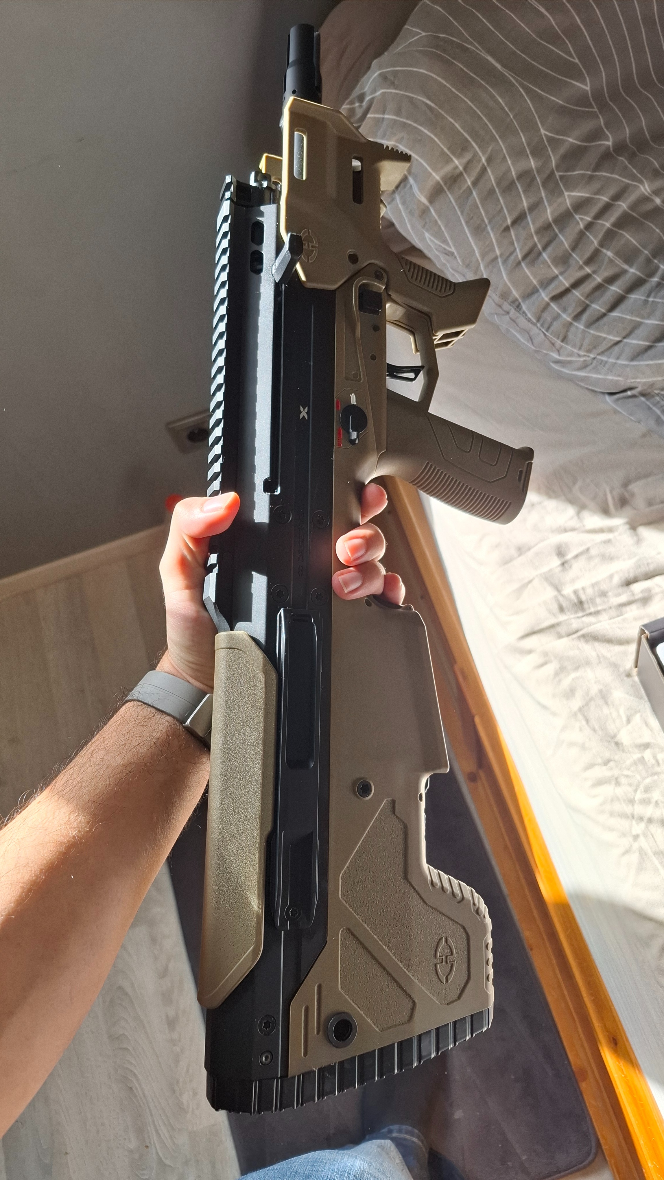 Je la vend car je n'arrive pas a me faire au bullpup malgré la réplique ai des perf incroyable en sortie de boite.