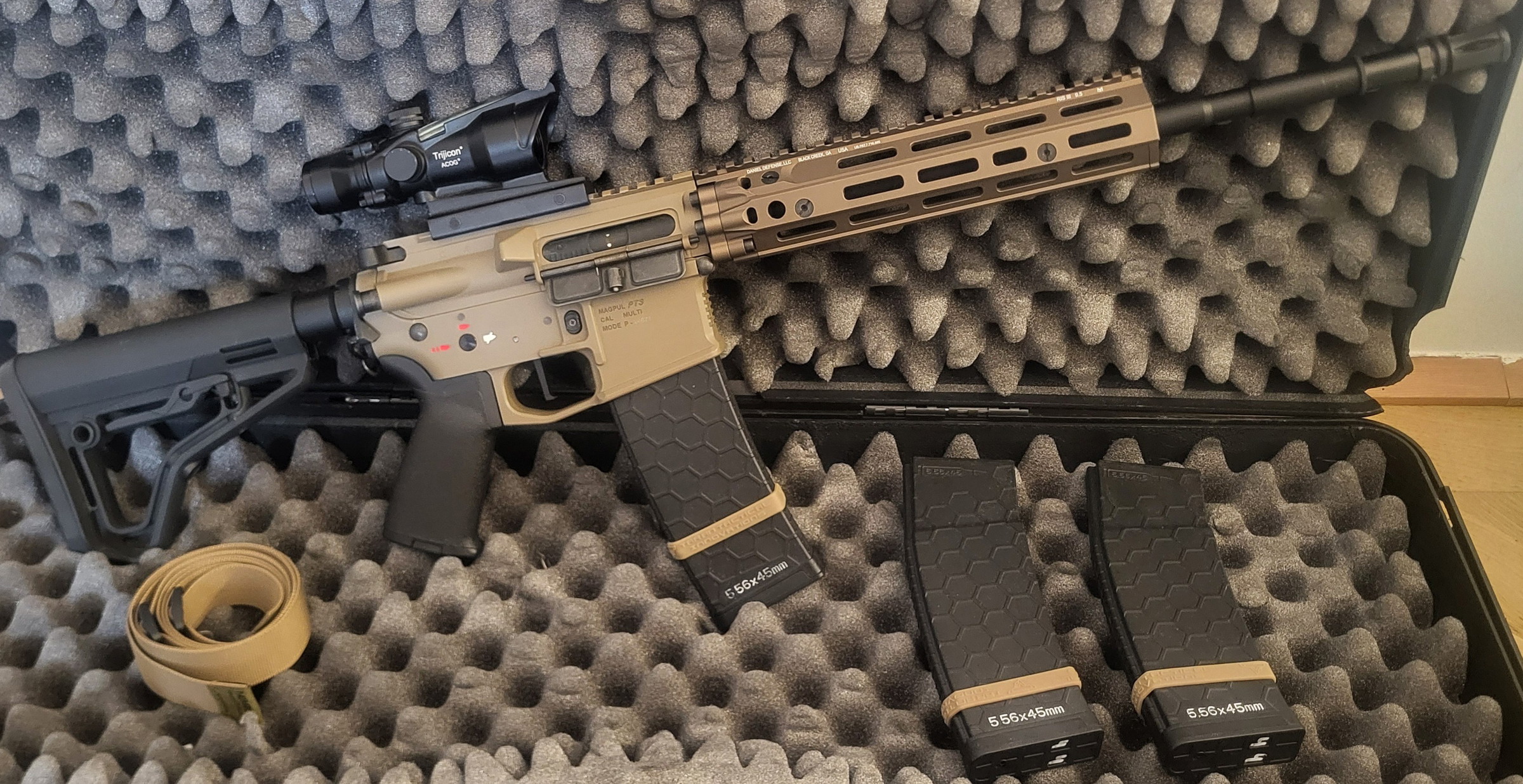 Novritsch SSR4 based DMR with 407mm high precision 6.03 Modify inner barrel, original Magpul recievers, and Daniel Defence M-lock handguard. Fully licensed with unique IDs. ACOG trijicon replica prism scope is included