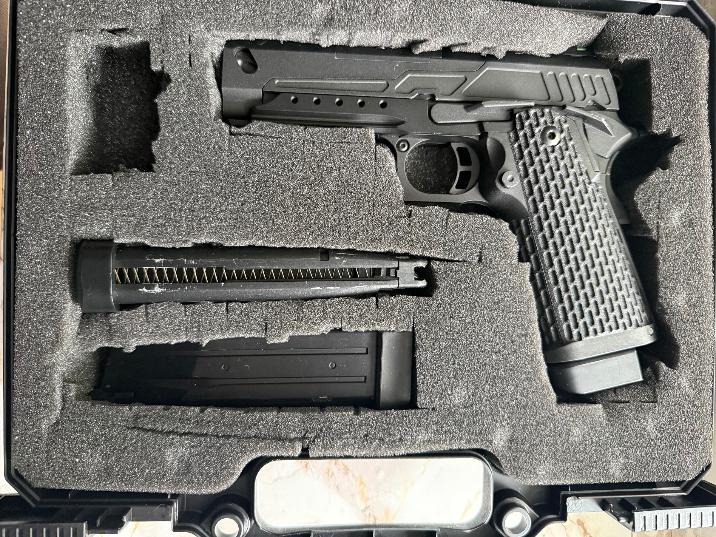 zum Verkauf stehen 2 extra Magazine, ein Koffer und 2 Gas Flaschen Grün, eine ist voll die andere halb voll.