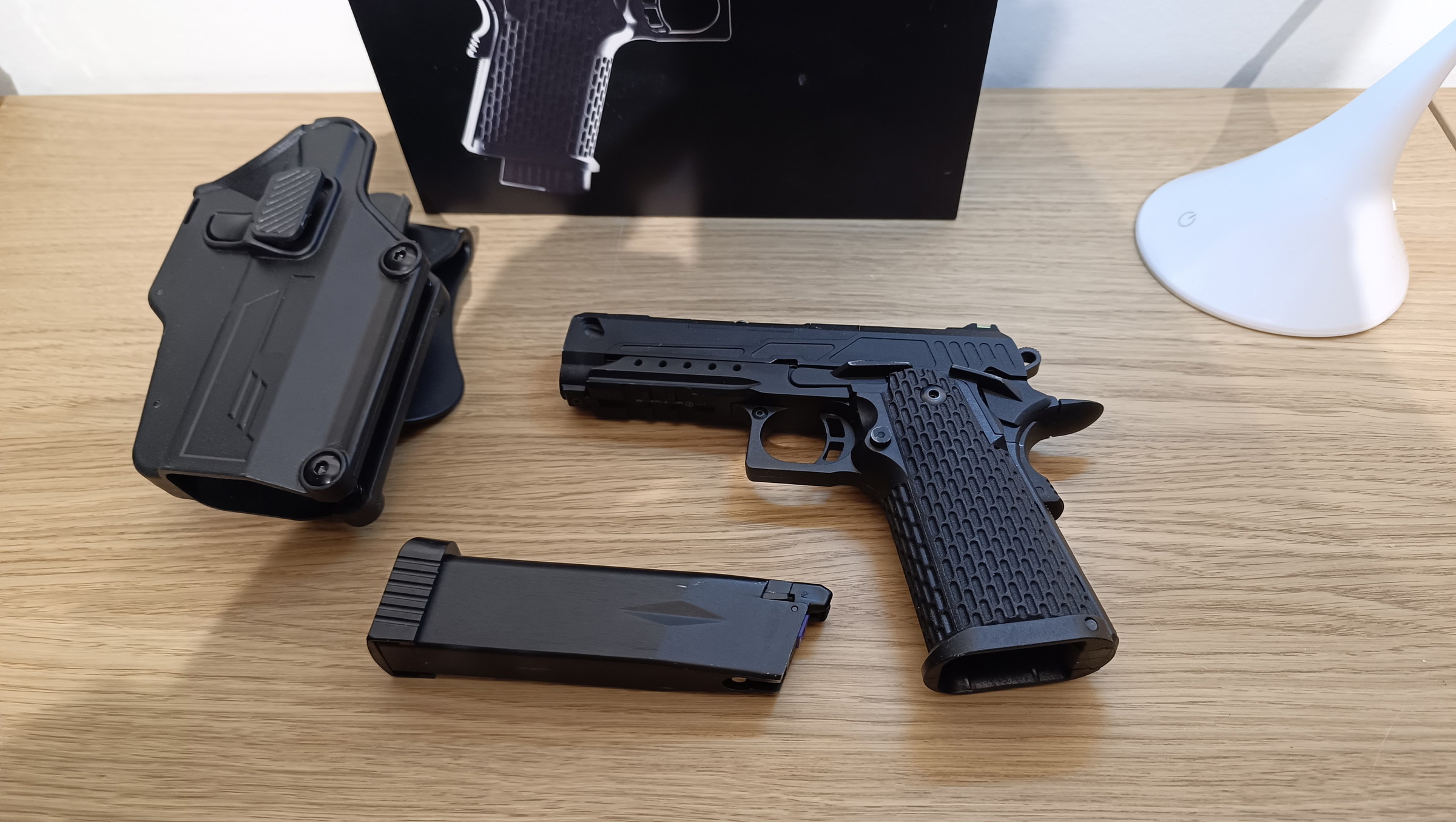 Good as new Novritsch SSP5. I've only used it in the backyard. There are some mild usage marks, you can see them on one of the pictures. I've always cleaned it, and taken good care of it. But I'm Quitting the hobby and I need new money. It comes with a holster and 1,5 bottles of black gas (not on the picture).