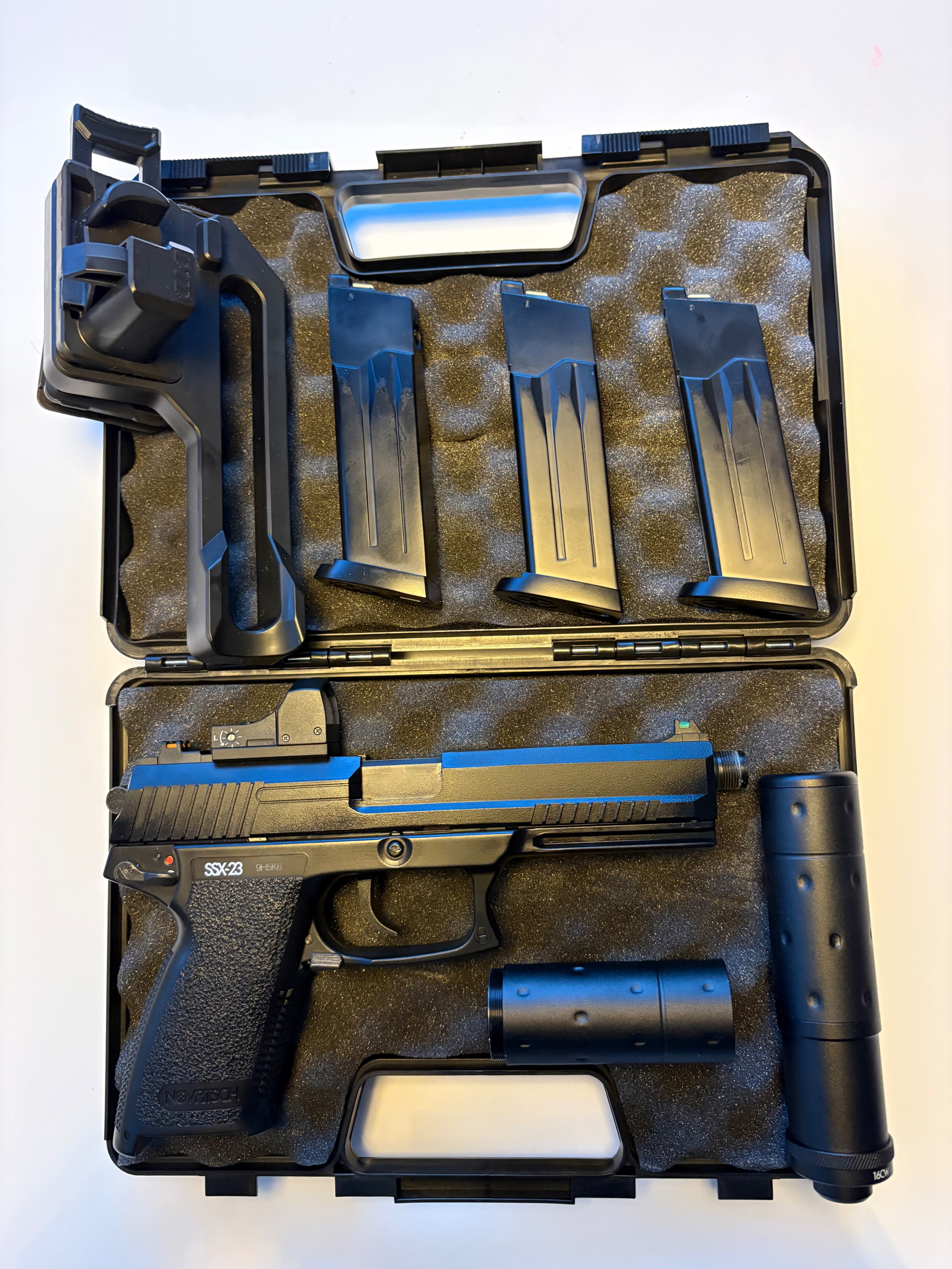 Gloednieuwe Novritsch ssx23 inclusief 2 extra magazijnen dus 3 in totaal, nieuwe red dot montage plaat, nieuwe red dot, nieuwe modulaire demper en een nieuw holster met combat belt clip.