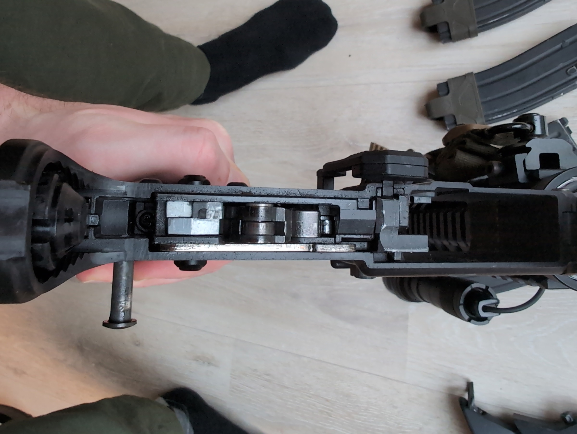 Deze MWS heb ik van binnen helemaal stock gelaten, behalve uiteraard de NPAS en befaamde rode hop-up arm. De meeste aanpassingen zitten aan de buitenkant en allemaal het beste van het beste gekocht, zoals de Vortex red dot, Streamlight zaklamp, Ferro Concepts Slingster en noem het maar op.