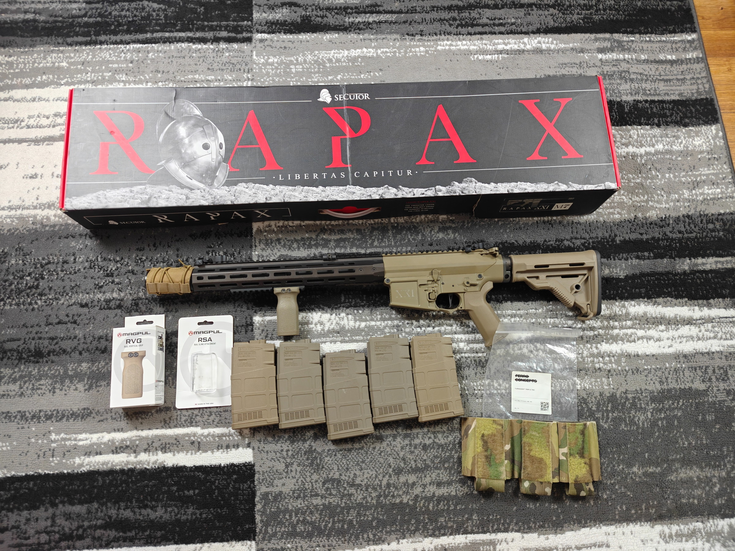 Wts rapax m7, vendue avec 5 chargeur, vendue avec poignée et attache sangle magupl. Elle a vue 6 partie donc très peux servie.