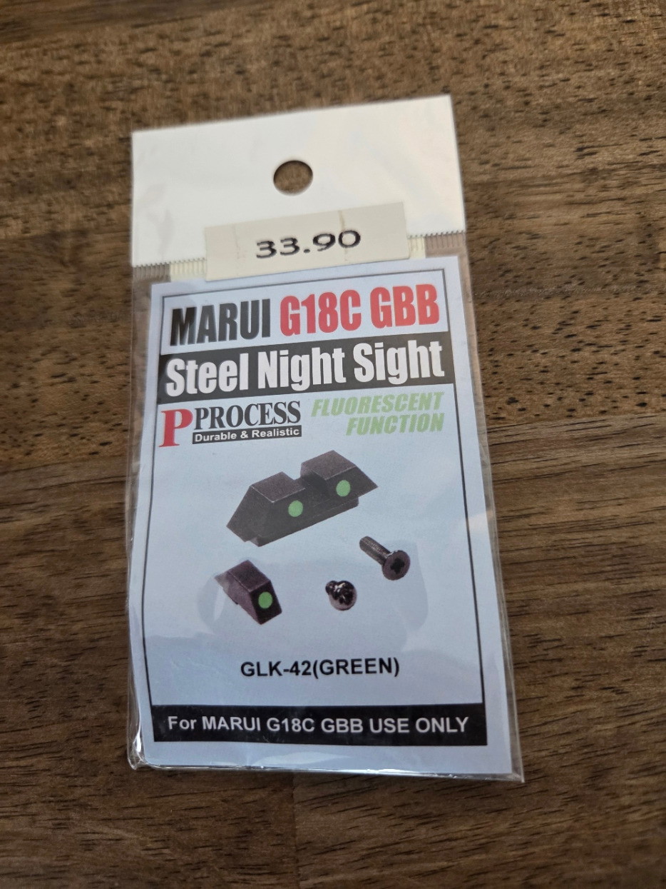 Brand new fluorescent iron sight set designed for Tokyo Marui G18C replicas.