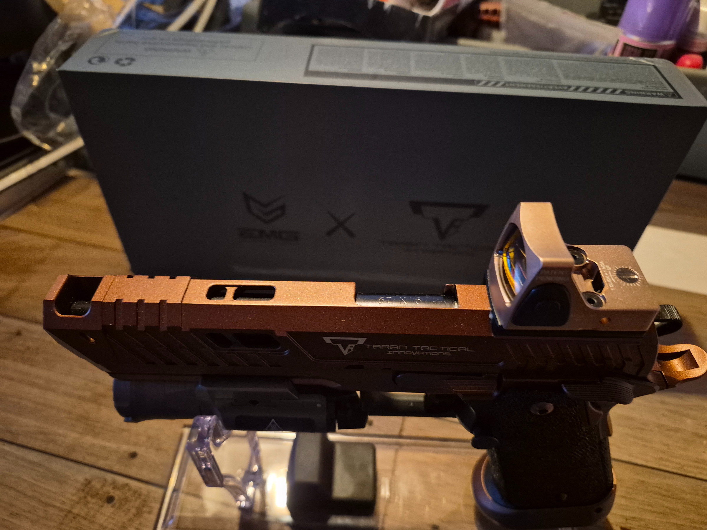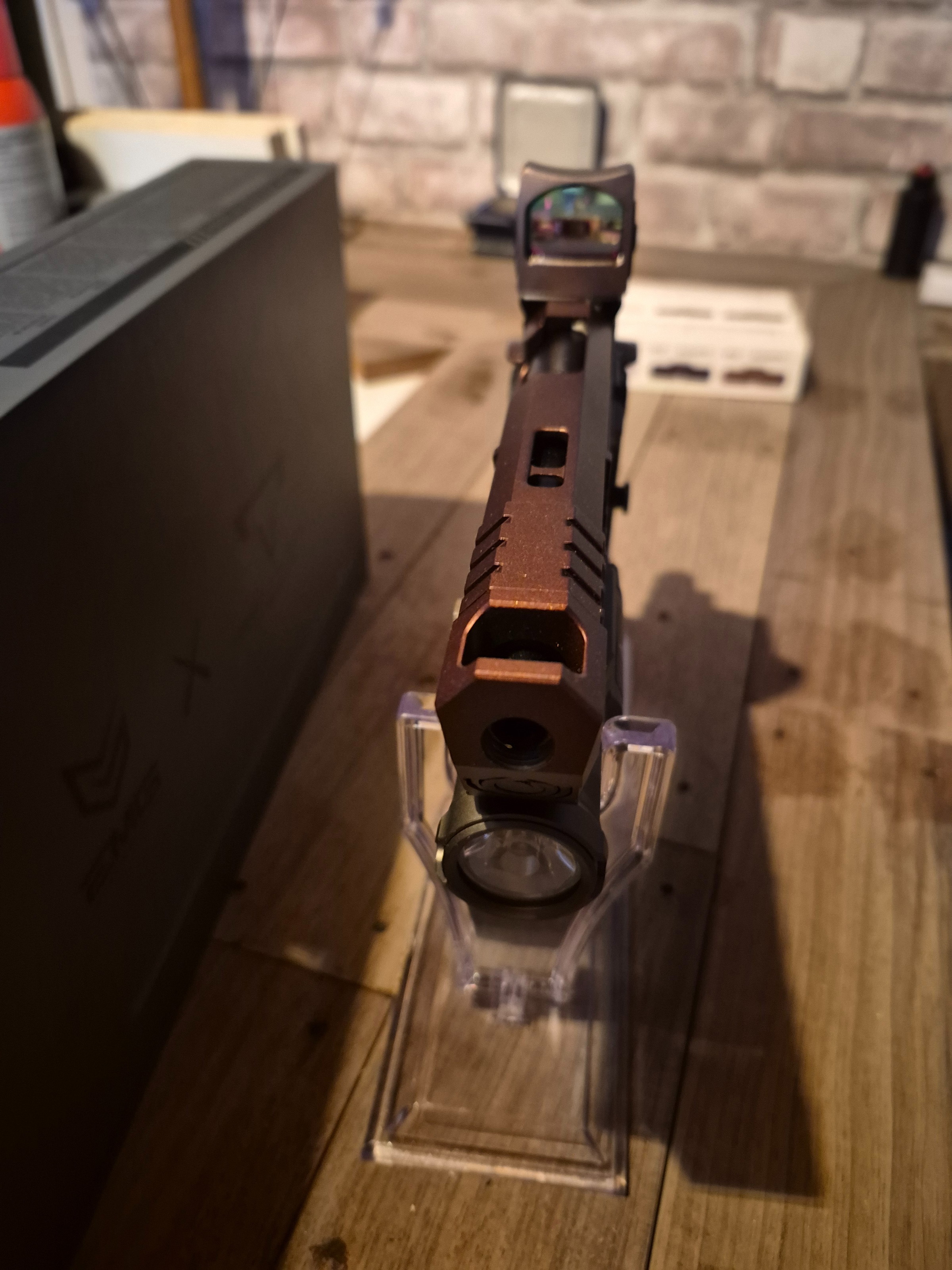 Dus met reddot lamp met stroboscope en gewone functie en de didpkay stand en de doos