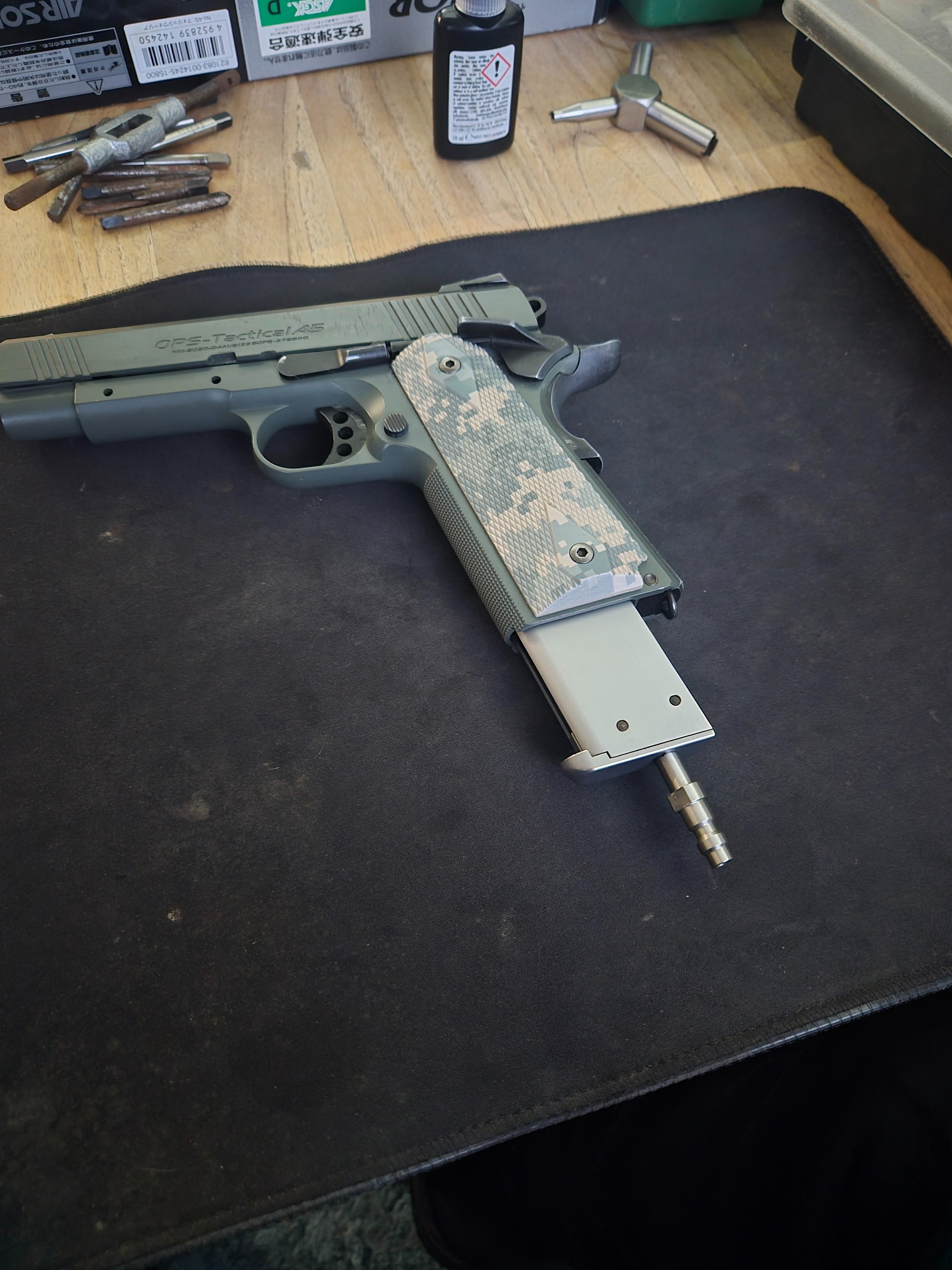 Ik biet me tm 1911 aan verkregen via in ruil maar de kast word toch iets te vol van daar de verkoop  ik heb in de slede  alles vervangen met originele tm onderdelen en loopt weer alles een zonnetje hopup moet nog wel ff worden afgesteld nog een tijd voor ge had in komt met 3 lek vrij hpa getapt magazijn bij interesse kan ik werkende video sturen