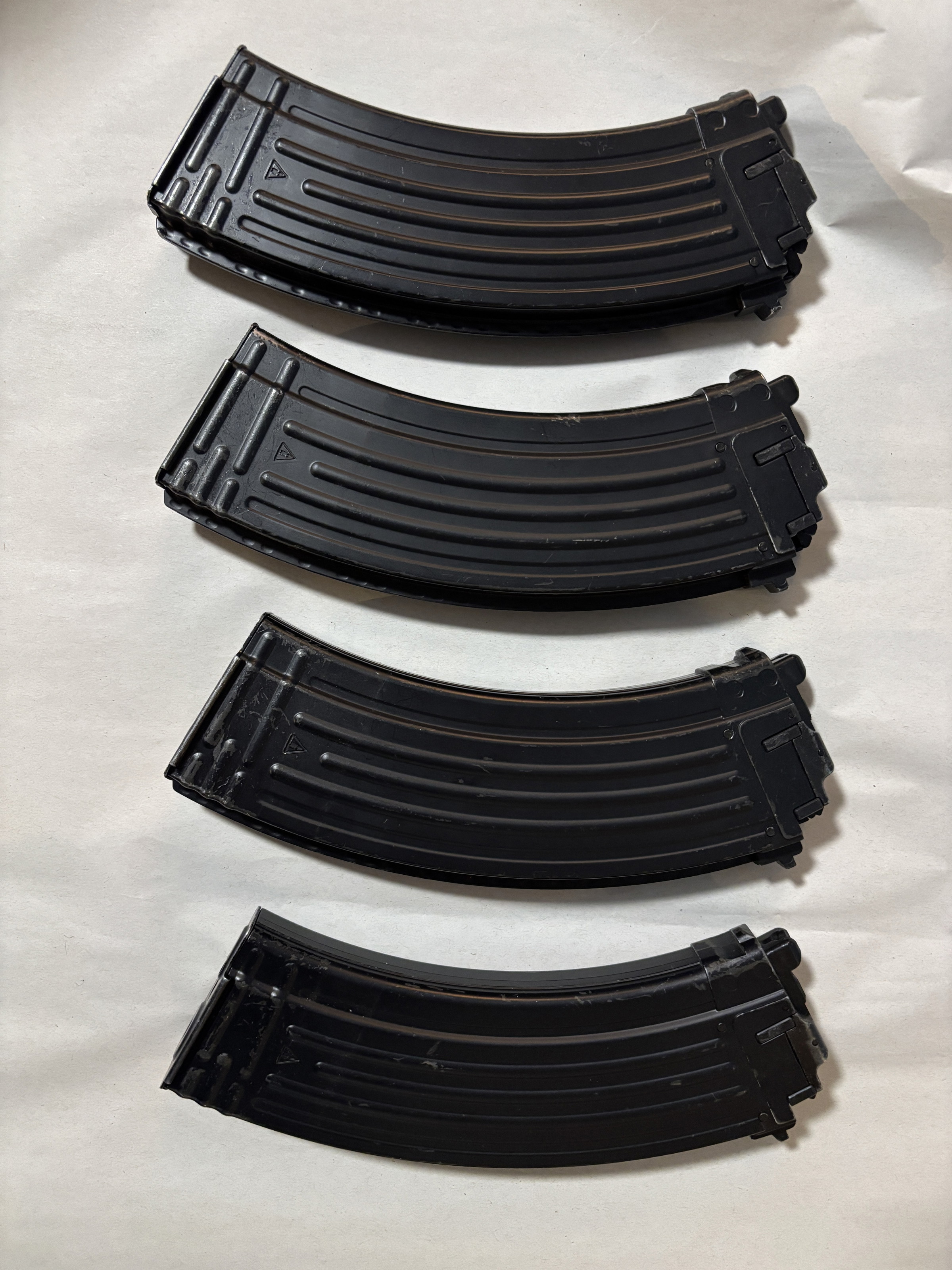4x originele Tokyo Marui AKM GBB magazijnen. De magazijnen zijn gebruikt en hebben slijtage langs de randjes (zie fotos), maar functioneren technisch goed, lekken niet en schieten consistent. Dit is recent getest.