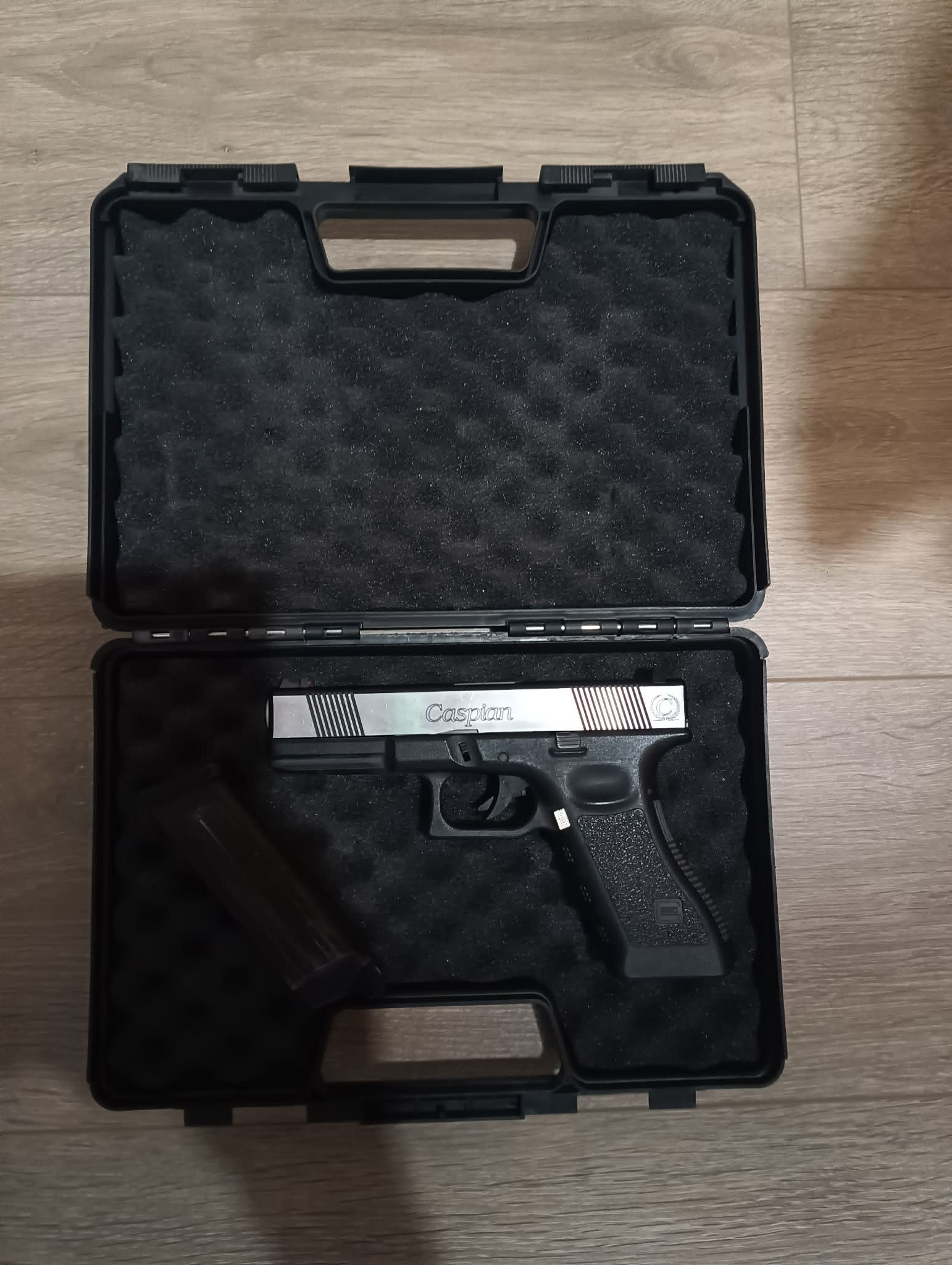 Custom Tokyo Marui G17 Gen3 Caspian. Dit is een uniek exemplaar en al zeer lang niet meer verkrijgbaar. Komt met 1 magazijn en opbergkoffer. Zelden gebruikt geweest omdat ik er nogal weiger over was.