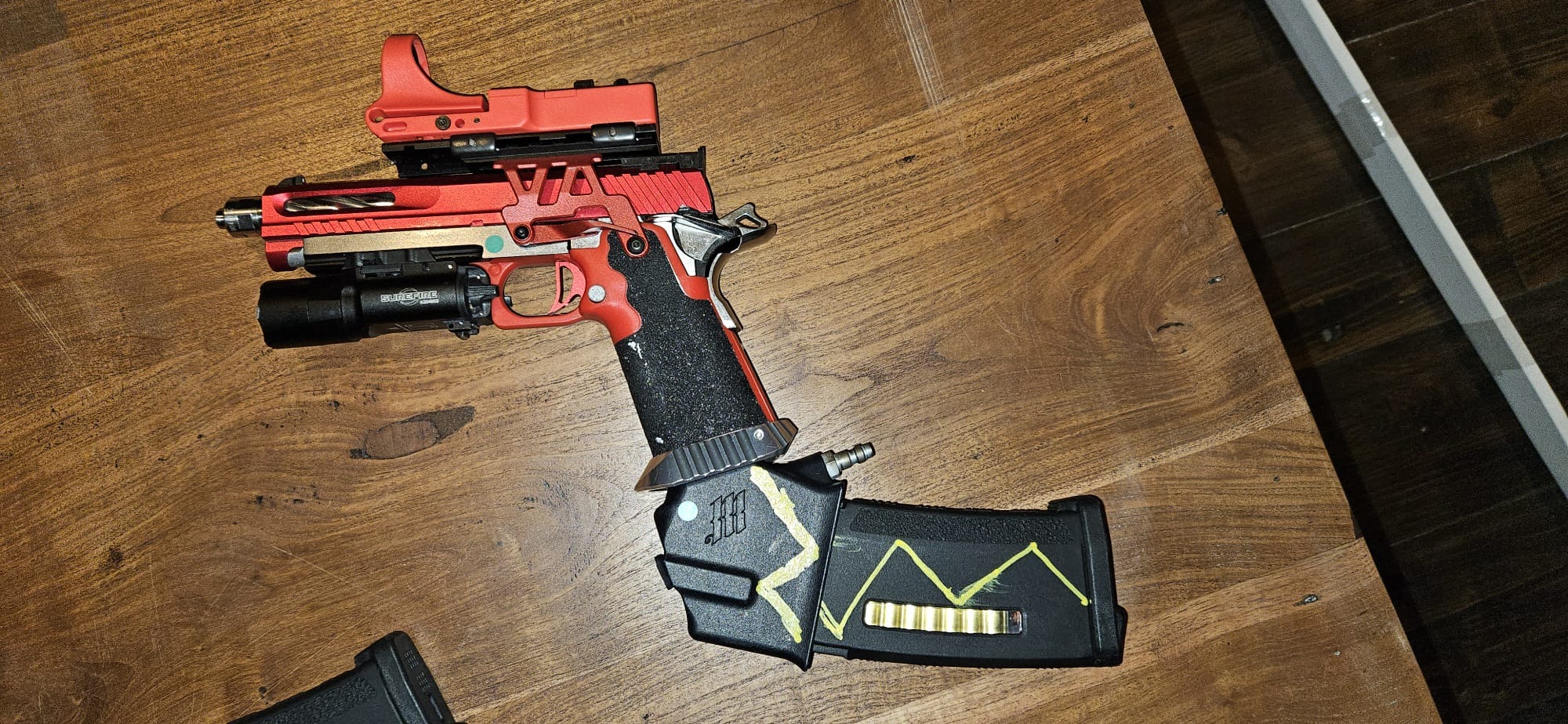 Pistool is fully upgraded en customized, enkel het frame en de hammer zijn stock.