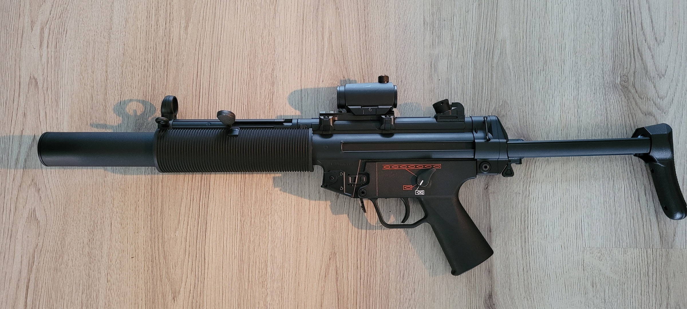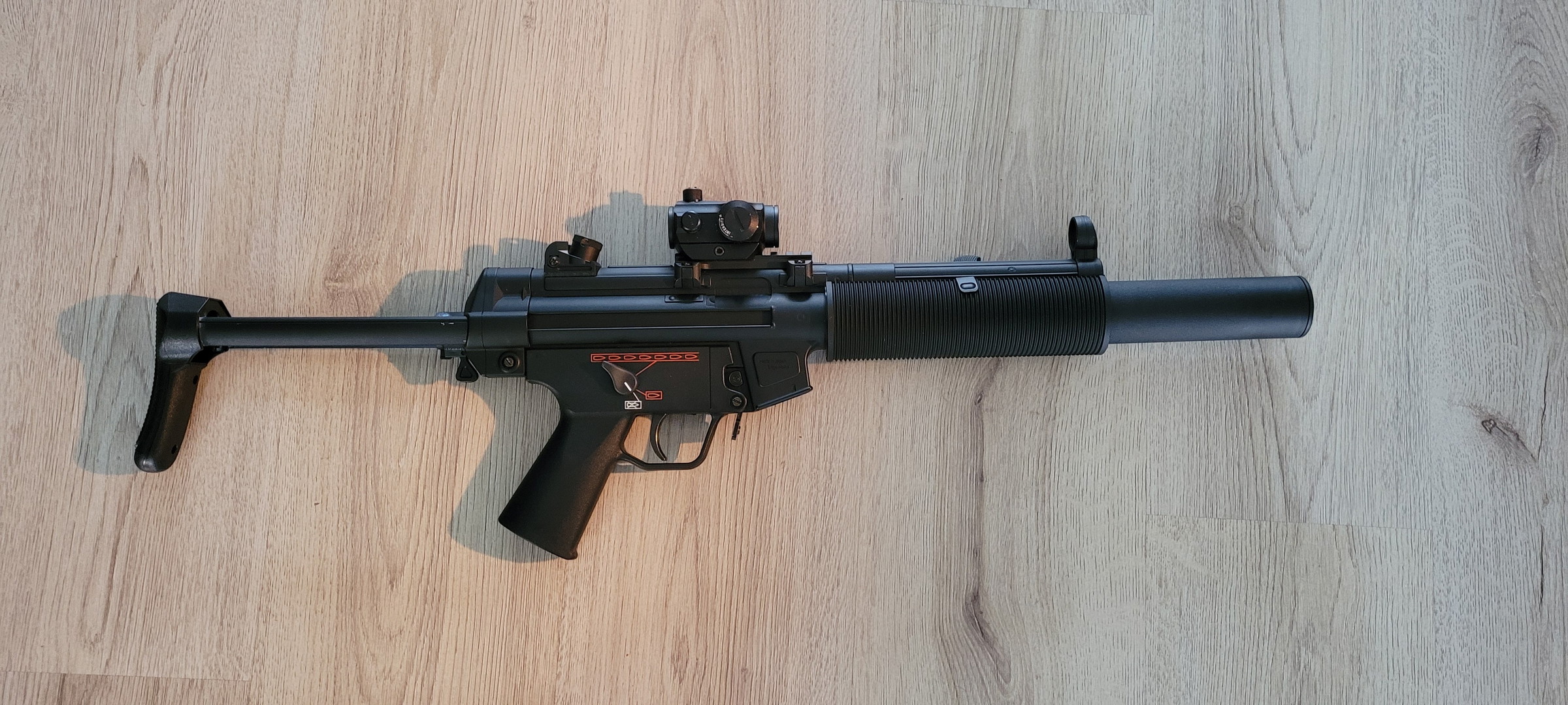 Tokyo Marui MP5SD6, komt met red dot, picatinny mount, 5 midcap magazines, NiMH battery, 4Uantum friction pro AEG bucking, inclusief doos. De replica heeft 2 Skirms meegemaakt.