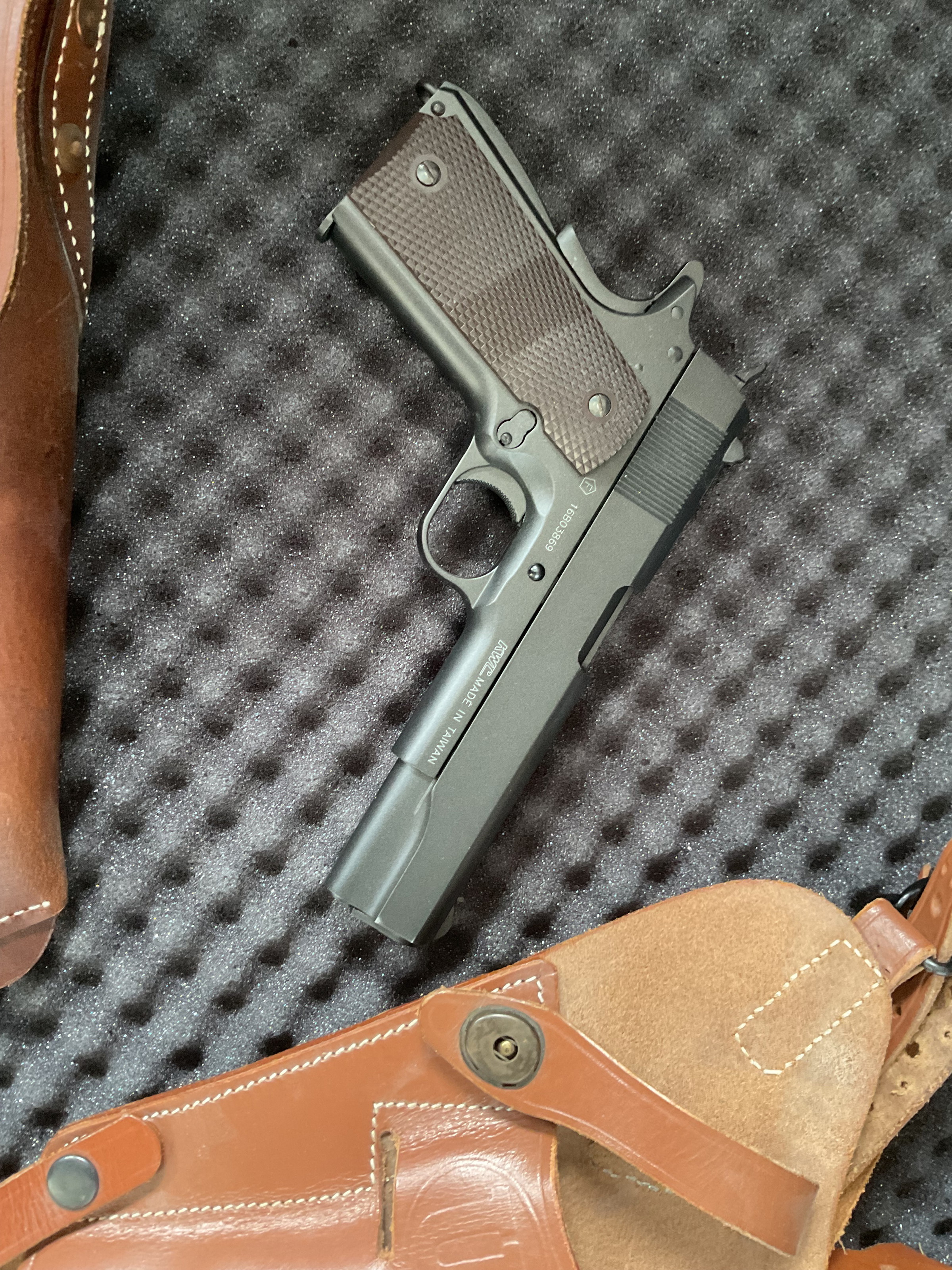 Twee Colts model 1911, de blauwe is hagelnieuw de rvs verkeerd in nieuw staat (model is niet meer leverbaar).