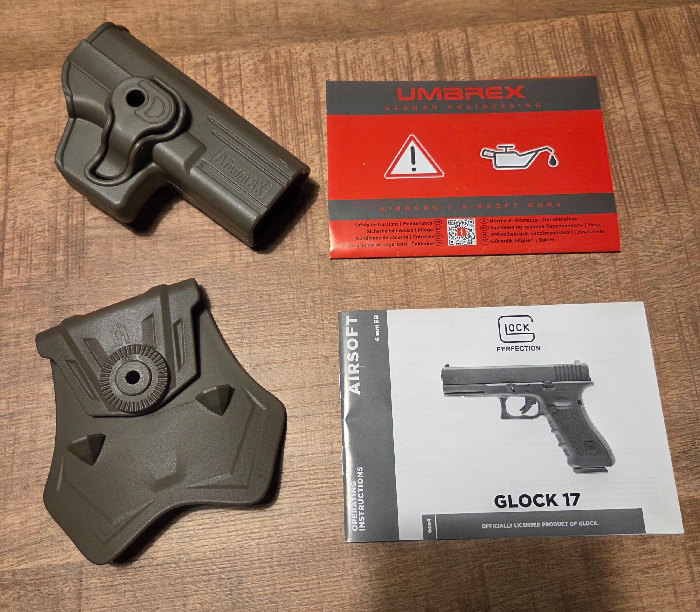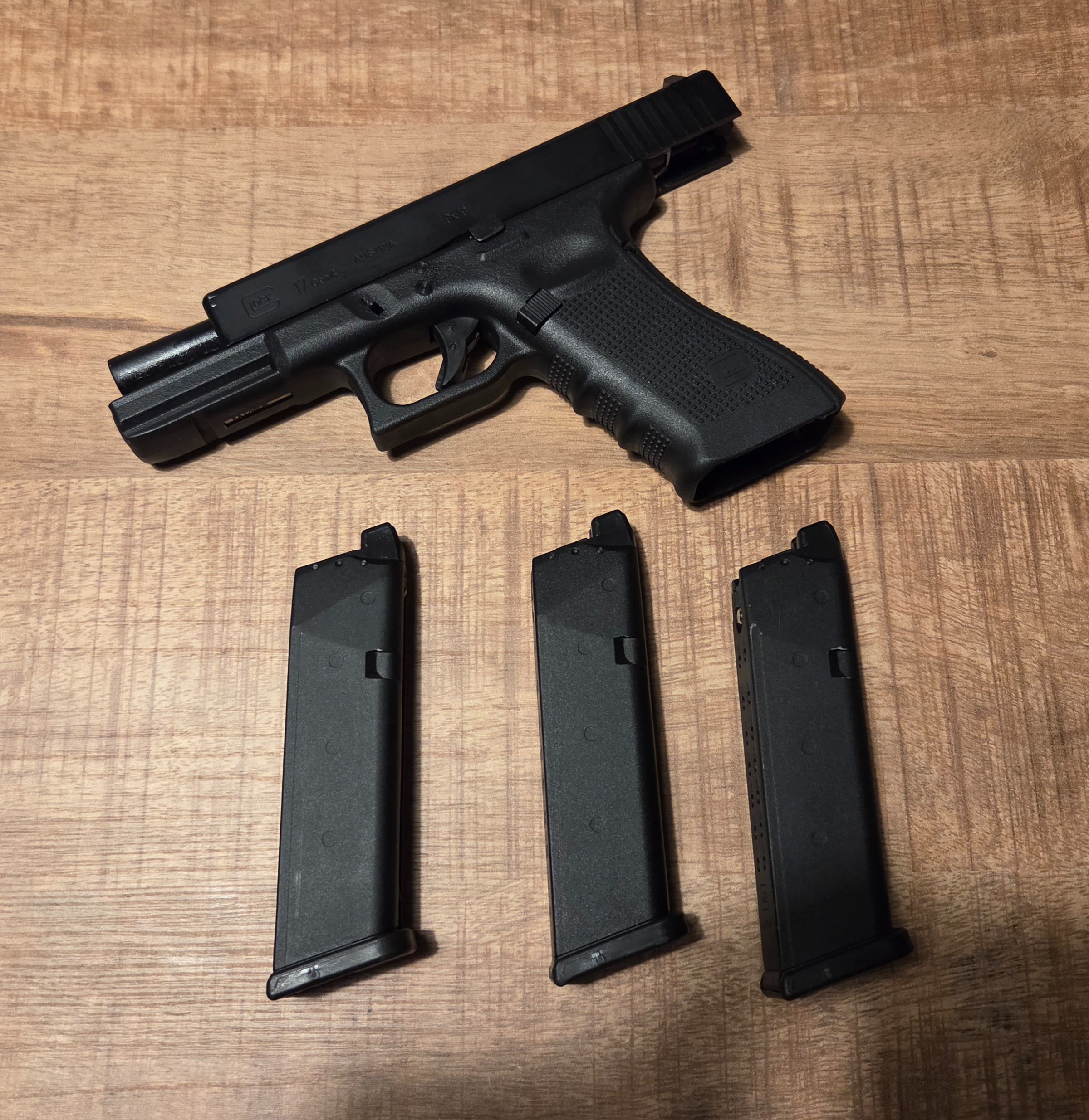 Umarex Glock 17 Generatie 4 op Green/Red/Black Gas. De set komt met 2 extra magazijnen (3 totaal), en een Amomax Holster. De Glock is gebruikt maar verkeerd in zeer nette staat. Hetzelfde valt te zeggen over de magazijnen. De replica + mags zijn goed onderhouden. Ik heb er dan ook nooit problemen mee ervaren.