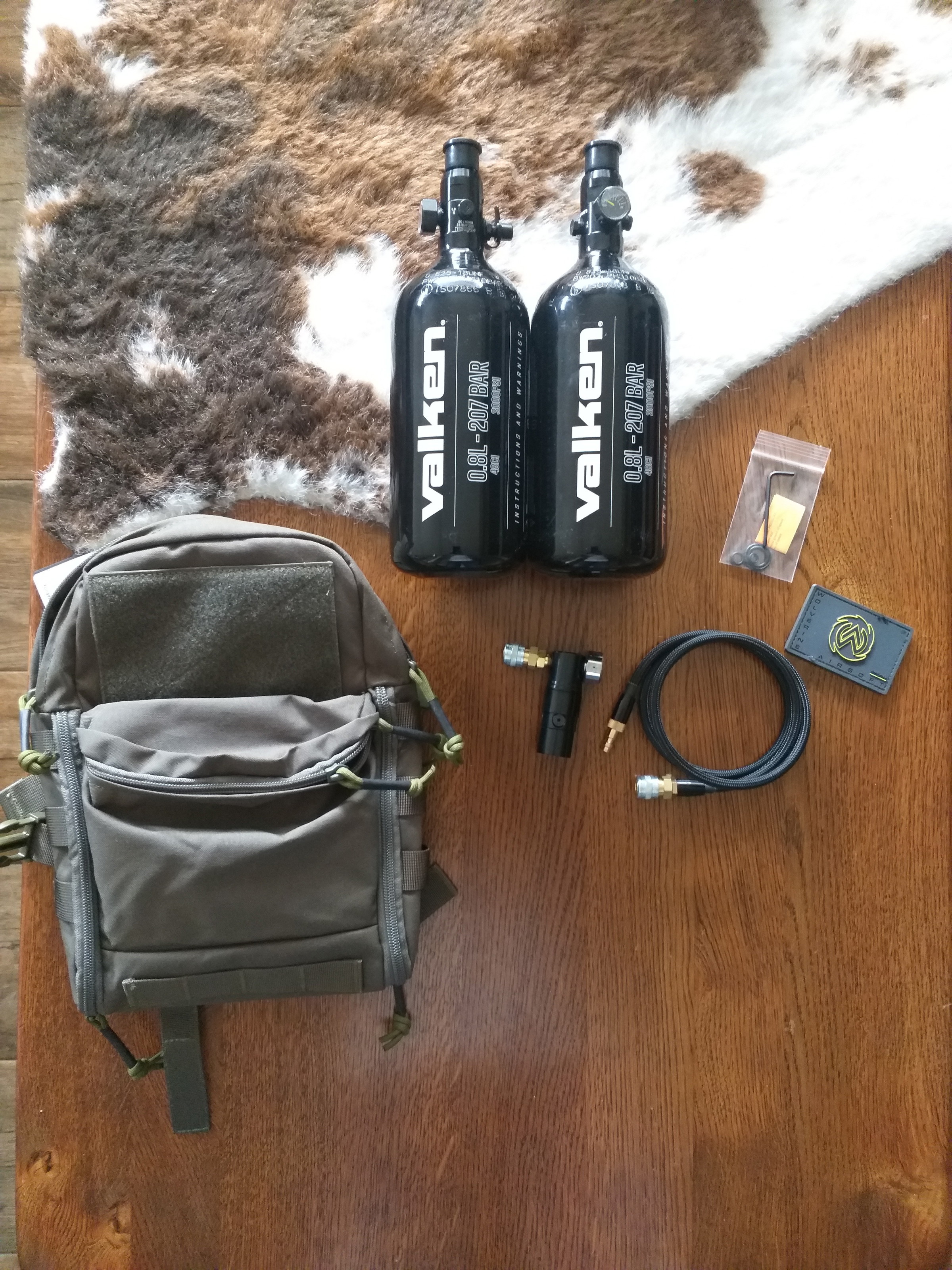 Ik verkoop de wolverine high pressure regulator met 2x valken flessen 0.8L 3000psi en een pouch.
