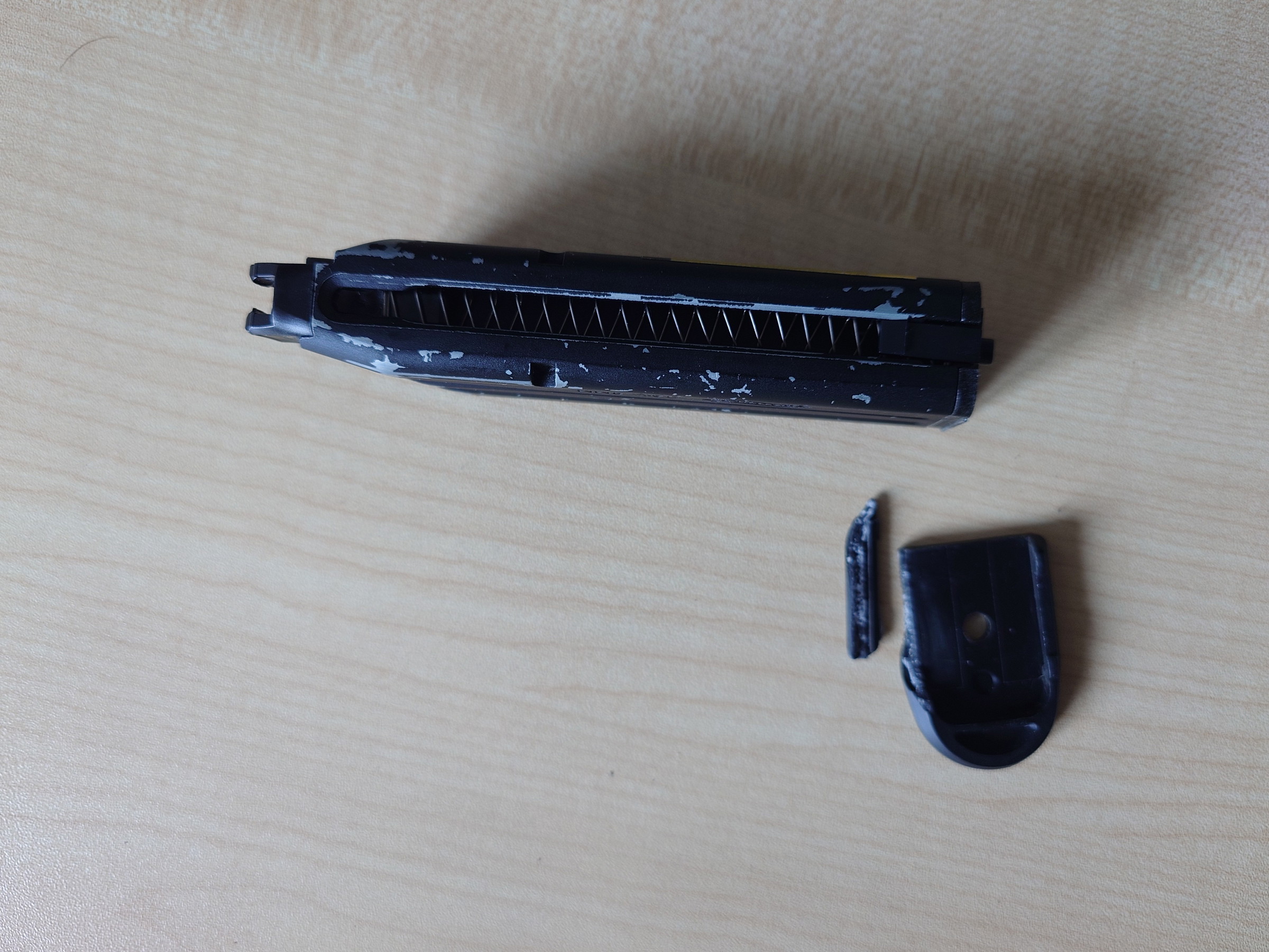 Mit Holder rechts und einem zweiten Magazin, das leider etwas kaputt ist. Aber es würde noch funktionieren.