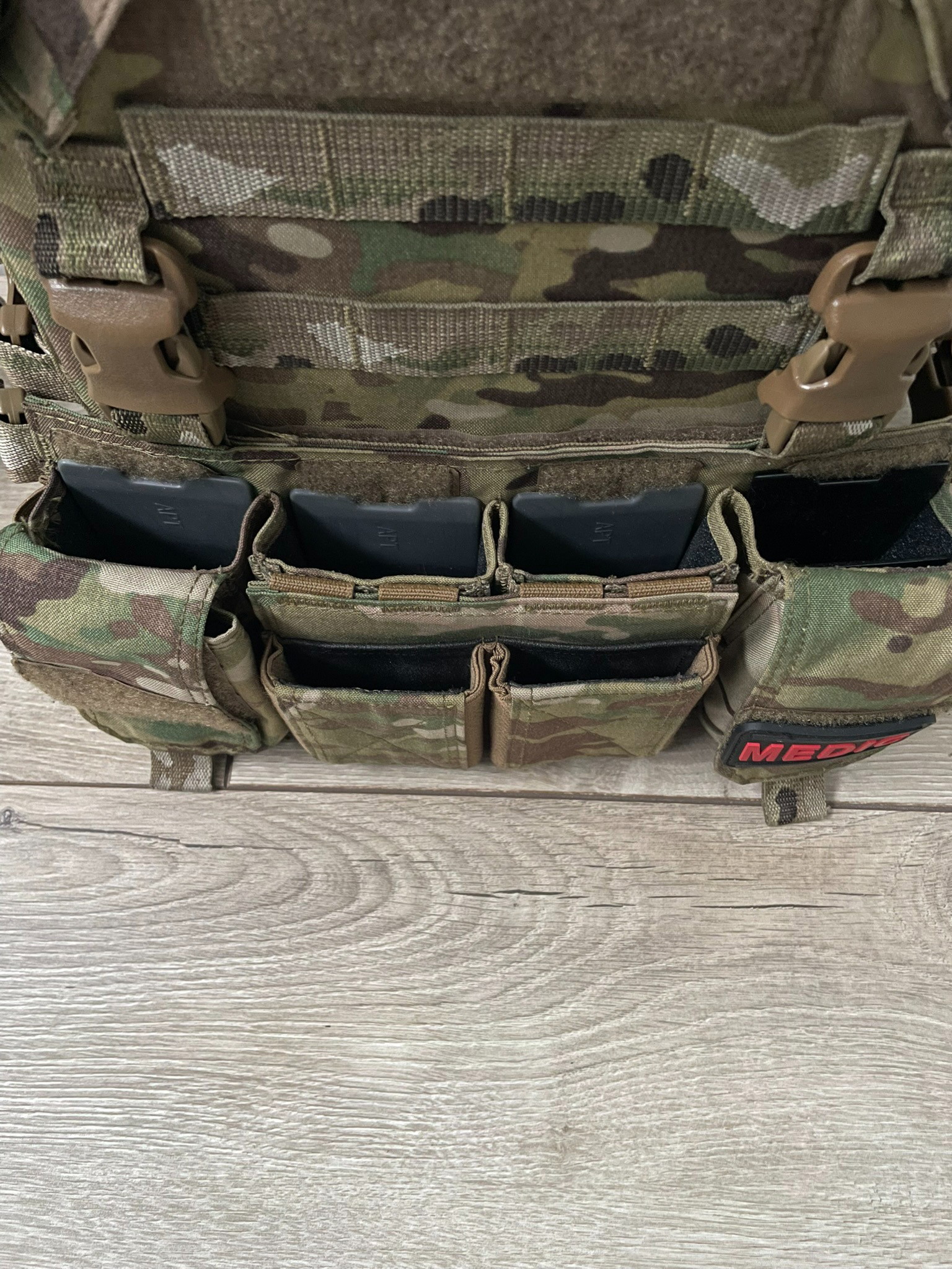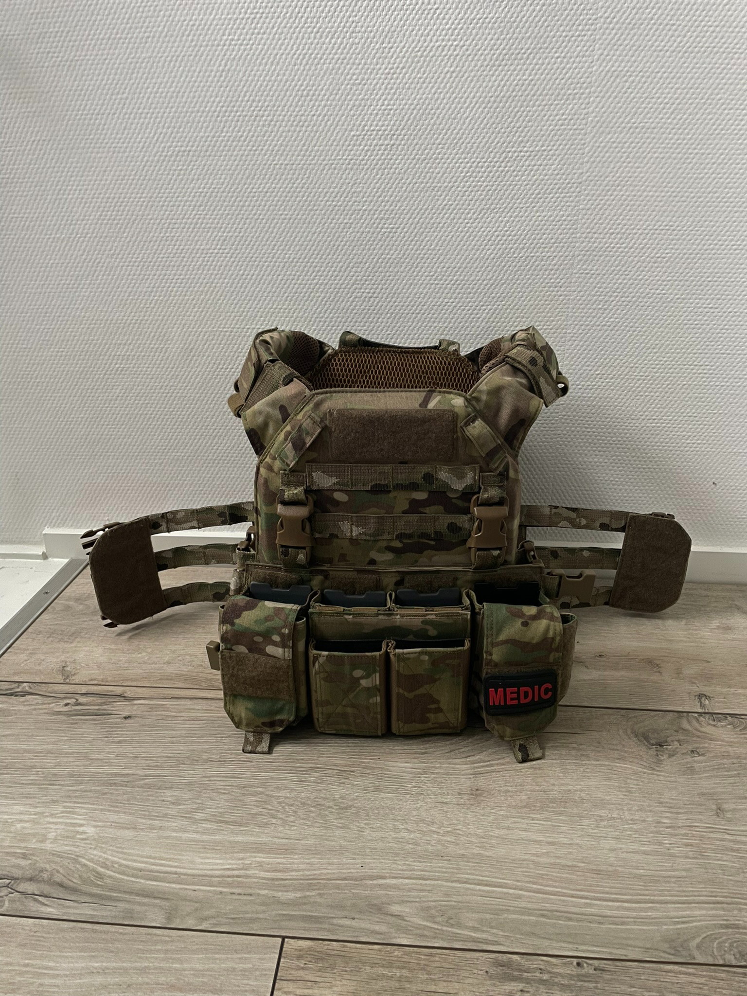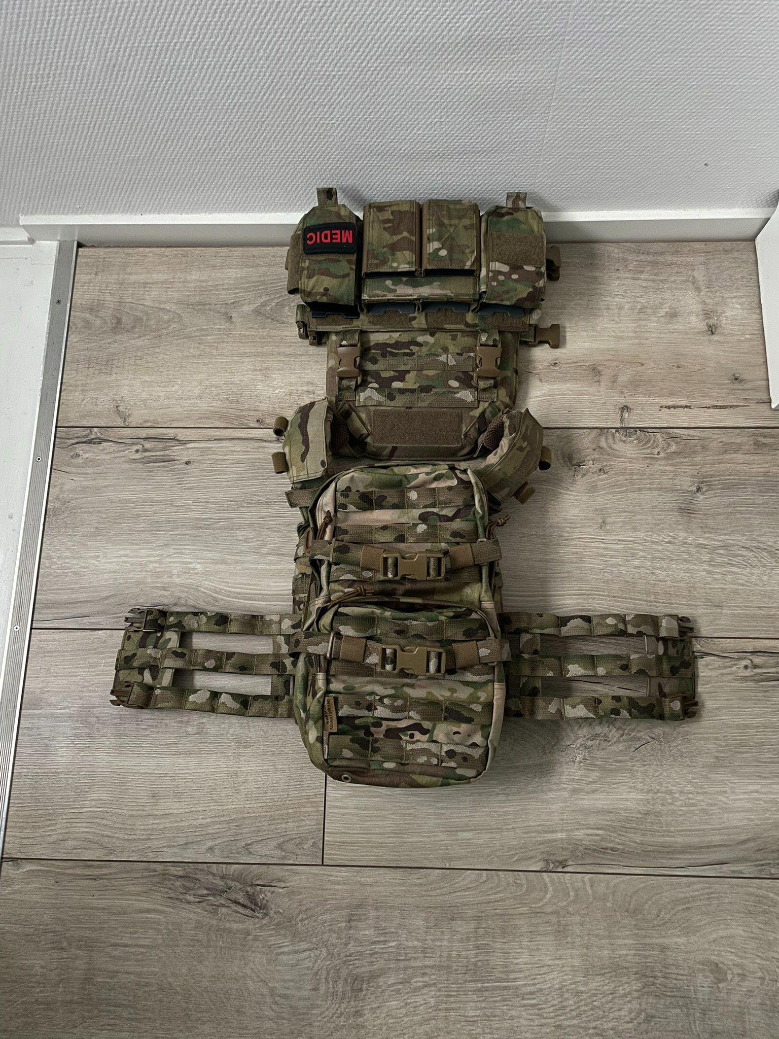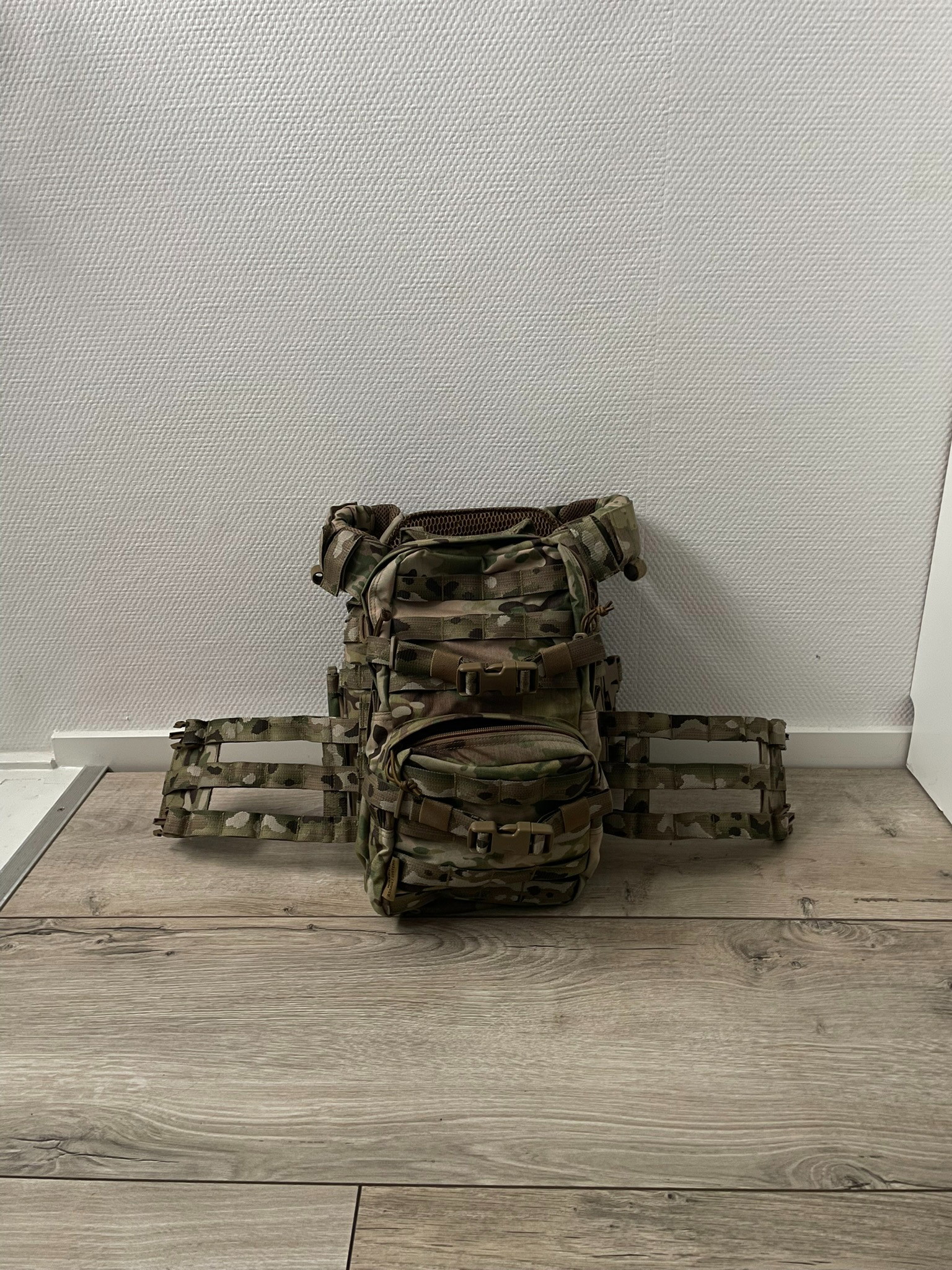 - Wordt verkocht als set (carrier + chestrig + cargo pack).