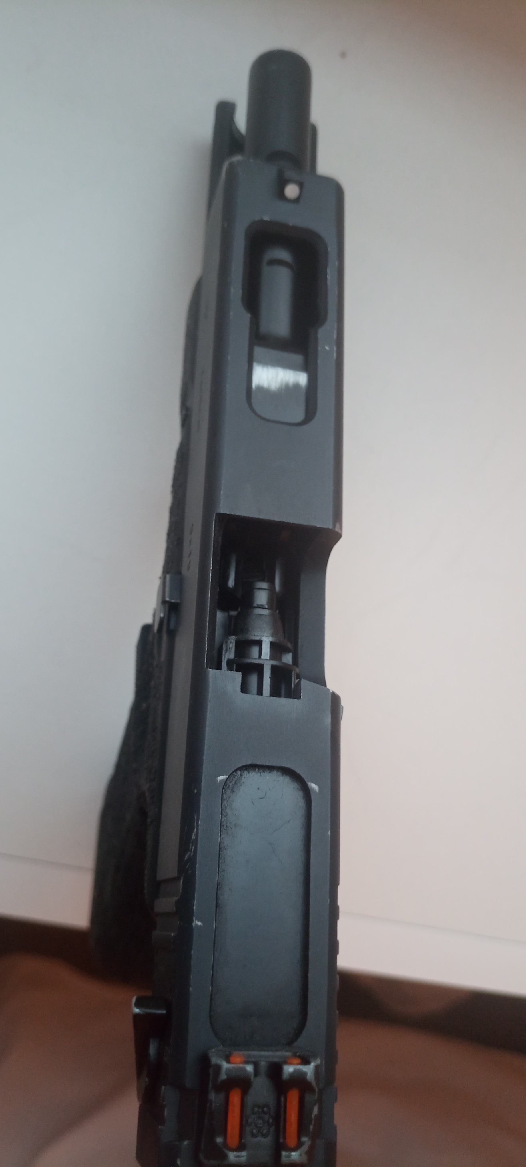 WE G18 sold with an official Umarex magazine. Propane powered. Several components have been upgraded: the rear sights are from a WE upgrade kit, an improved grip texture has been installed, the inner barrel has been replaced, but most importantly, the trigger has been changed. It has a shorter and lighter trigger pull, making semi-automatic firing easier and faster, for those times when you don't want to or can't fire in full auto. It is recommended to use dry gas to preserve the weapon's longevity and to manually lubricate it from time to time with silicone oil. WE replicas are known for their modularity and need to be upgraded out the box; they are quite easy to upgrade, and they are compatible with far more aftermarket parts than Umarex replicas, among others.