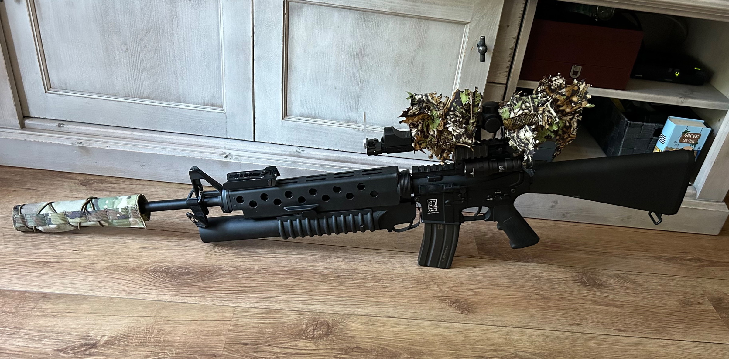 Deze mooie m16 met Launcher. Ik heb hem gekocht omdat ik hem mooi vond. Maar aangezien ik al wat ouder ben is hij mij te zwaar. Enkel thuis mee geoefend