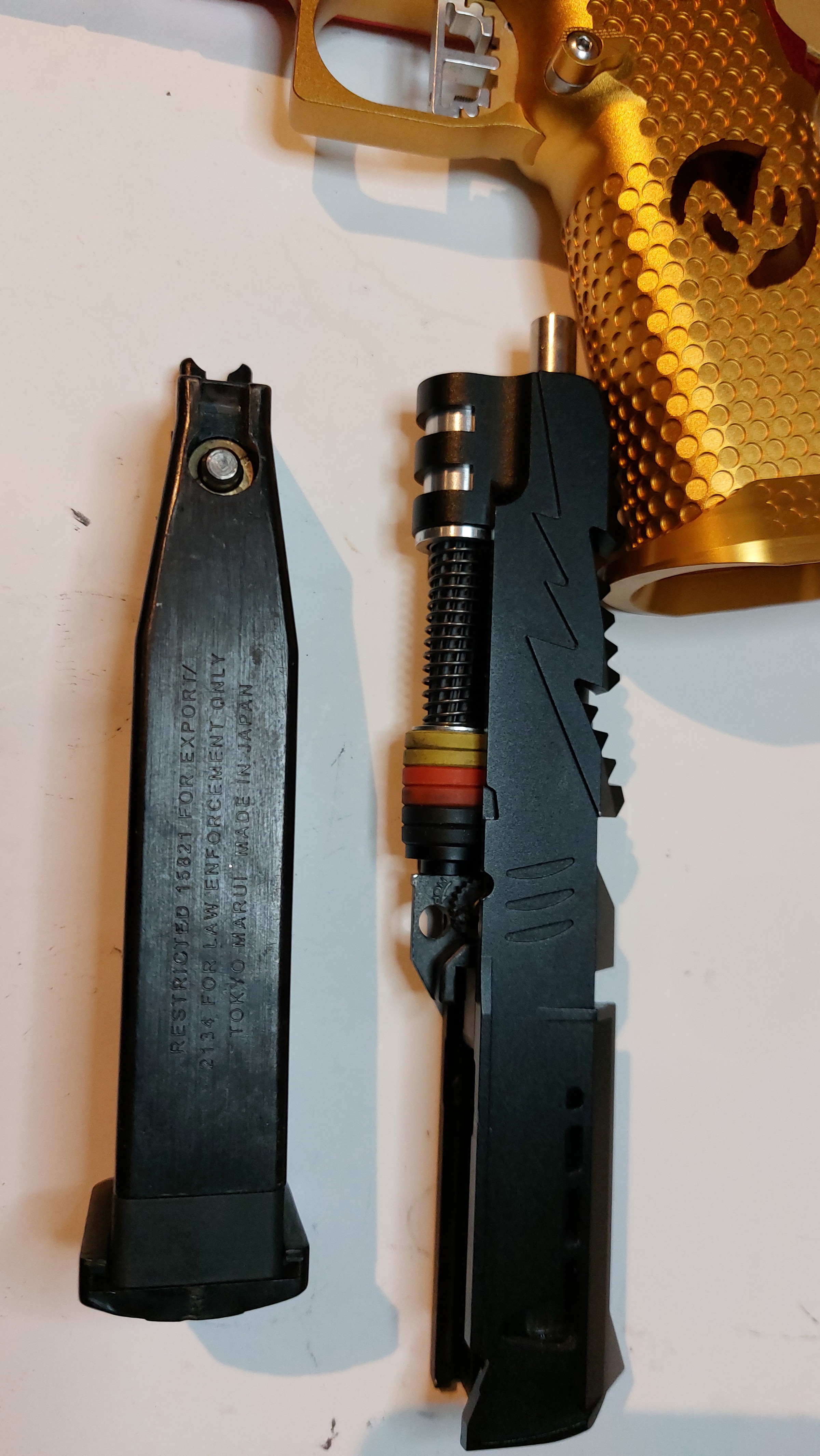 Advanced frame, Aluminium grip, guide rode, Vinci shark 4.3 slide, AIP slide stop thumbrest, AIP guide plug, AIP searspring, AM puzzle trigger, AM Hammer tuned, AM thumb safetys, Cowcow disconnector, Cowcow Vale reset, Cowcow short stroke buffer, Cowcow grip screw, lacapacustom turbo bbu, lacapacustom beavertail safety, guarder nozzle, guarder trigger bar, ML 6.01 113 innerbarrel, ML desecption 70° bucking, Edge 110% recoil spring, Tm hop up