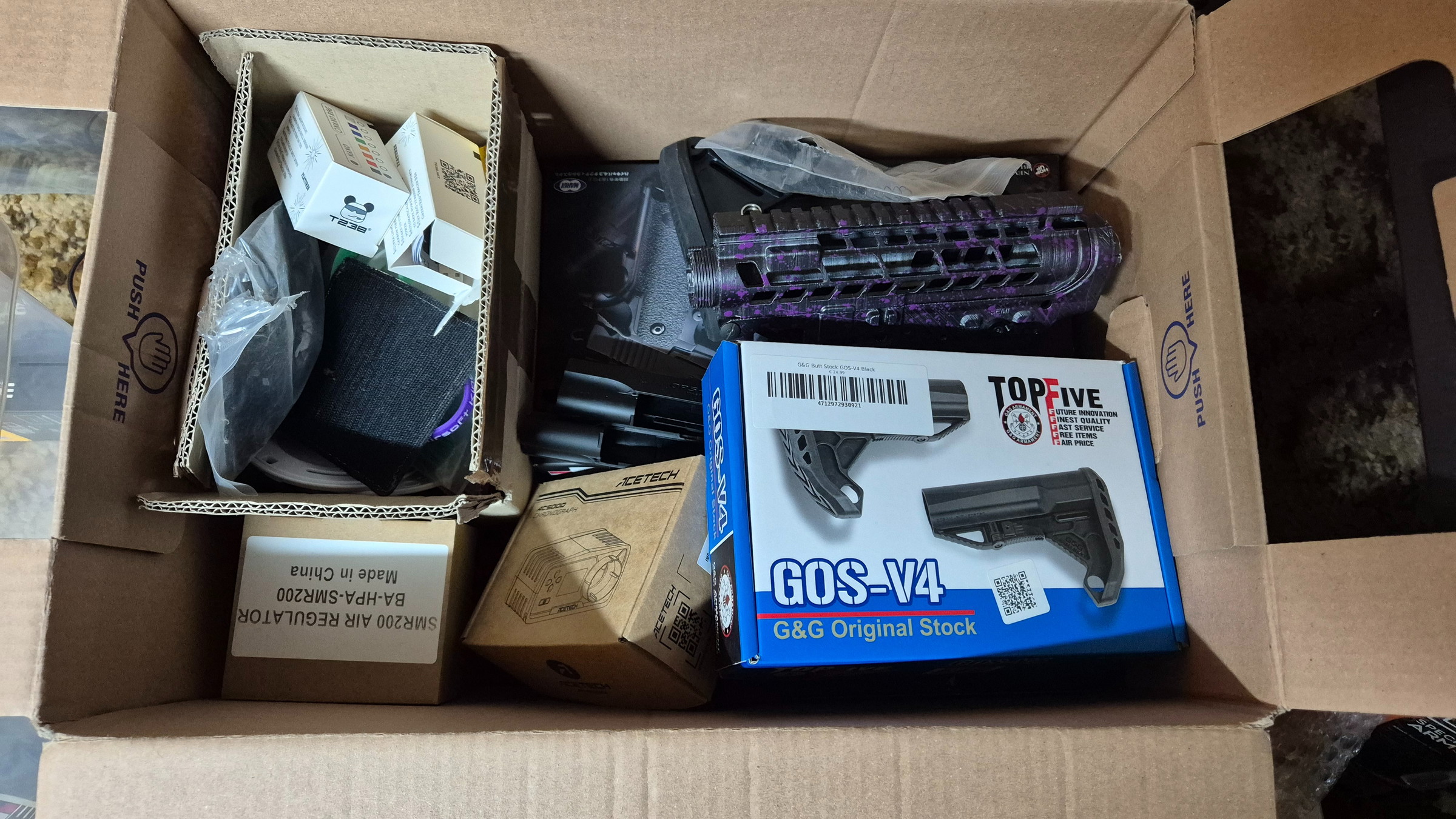 of een complete starter set, replica, adapter, hpa fles, slang, regelaar, tracer, poutches, m4 mags.