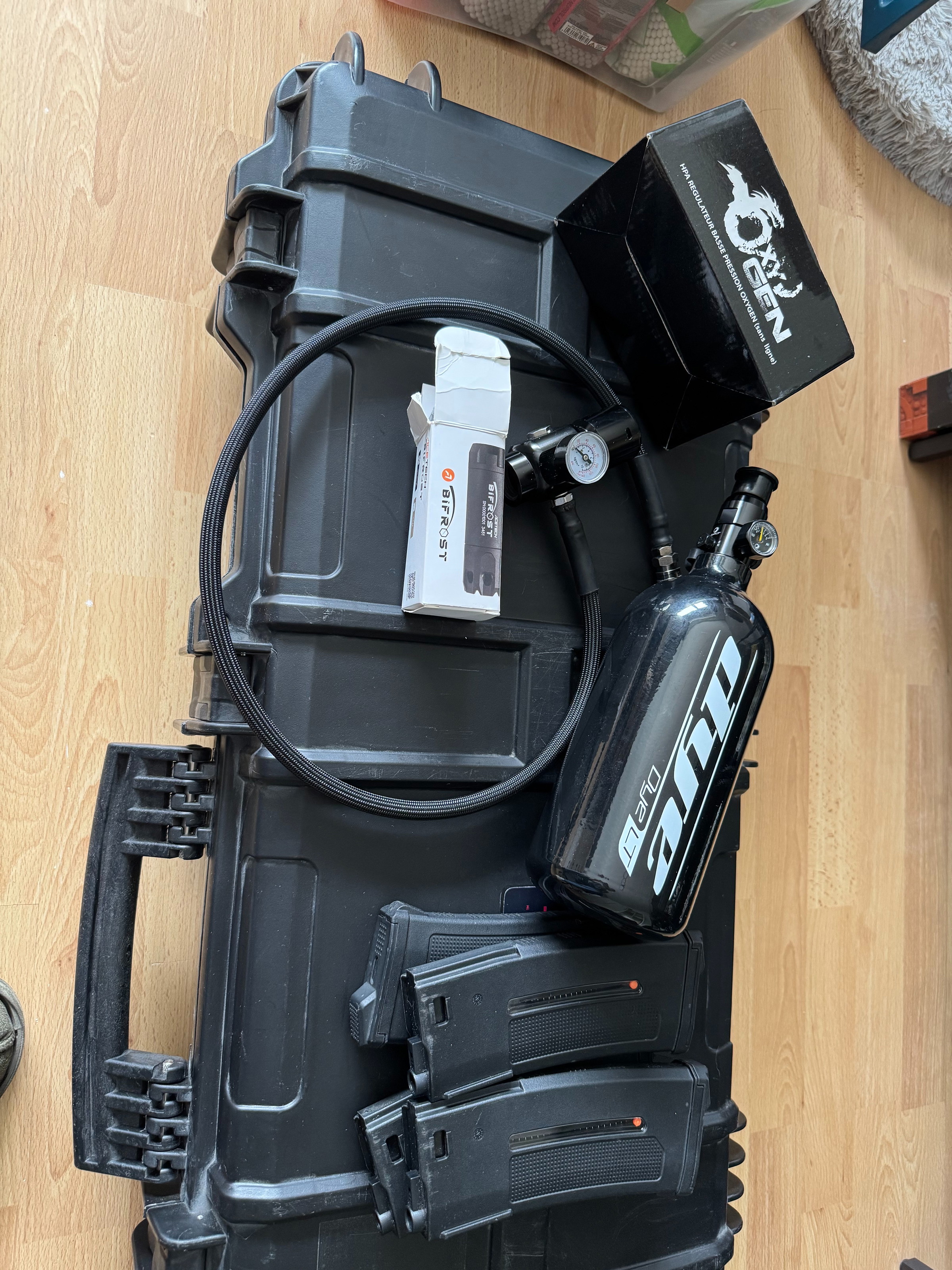 Voor meerprijs (β¬250) ook een complete HPA bundel met magazijnen van PTS, HPA tank, HPA lijn en HPA regulator zodat je direct het veld op kunt!