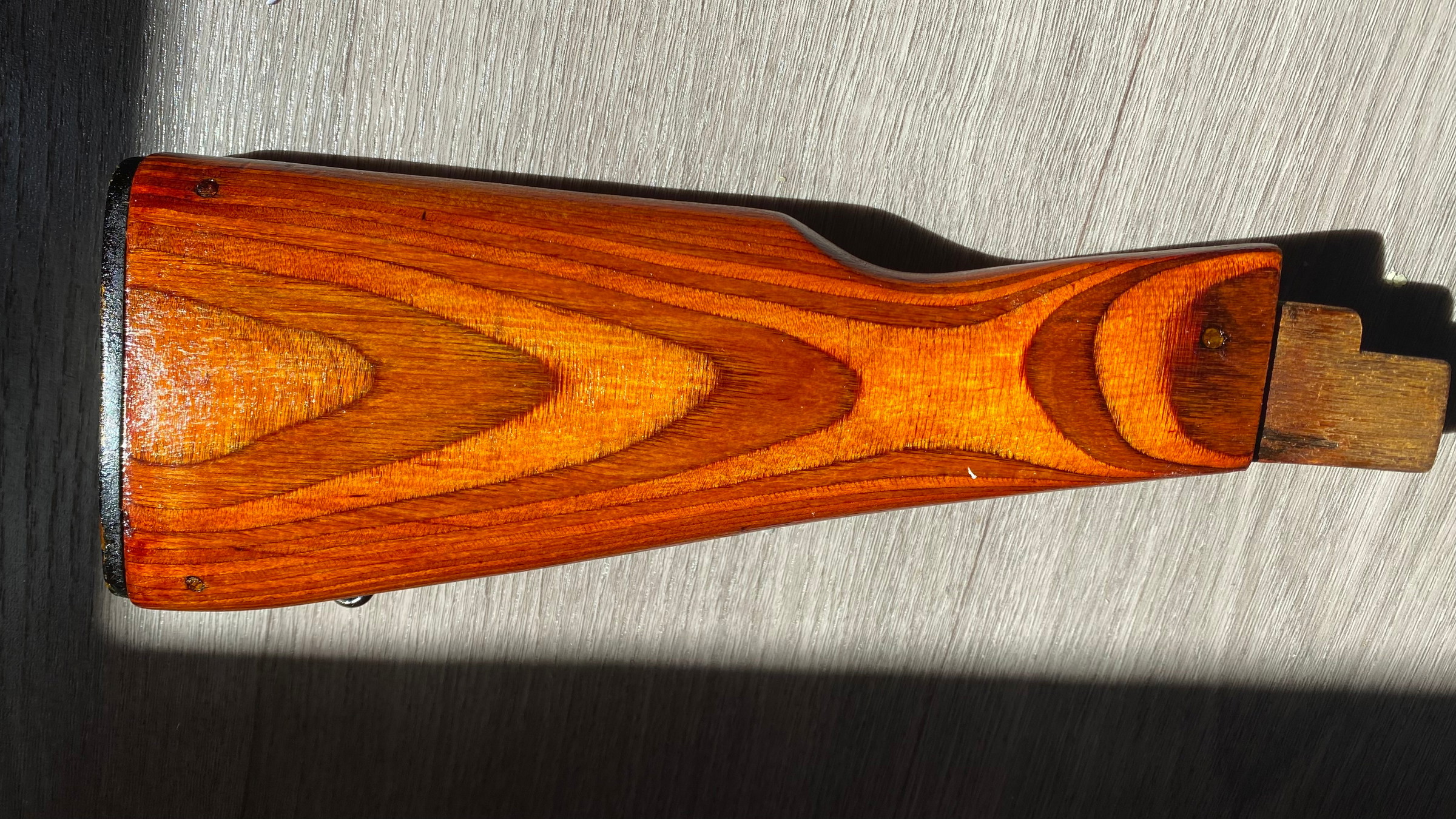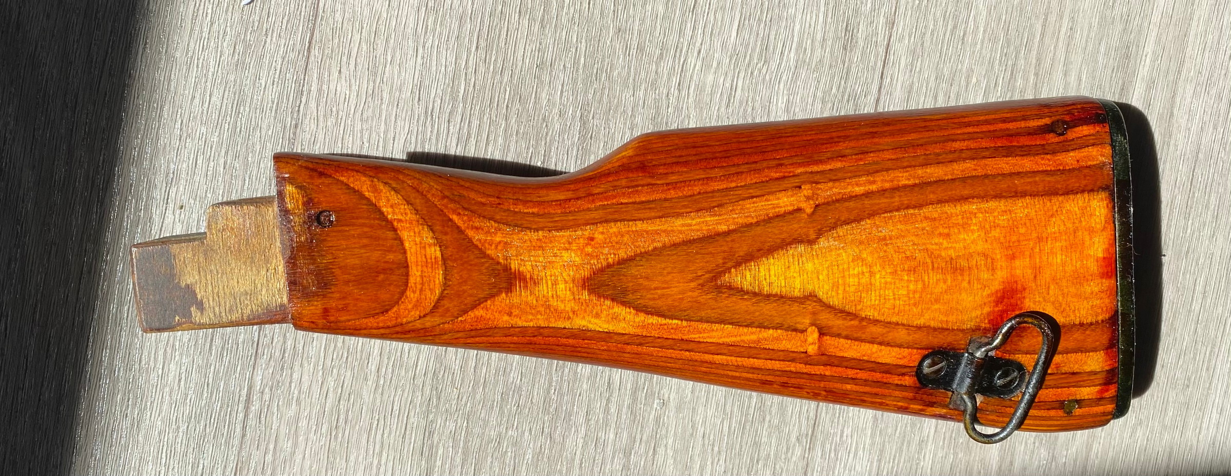 RS wood laminate from Izhmash. Very nice amber/Gold finish. Not compatible with AEG without heavy mods.