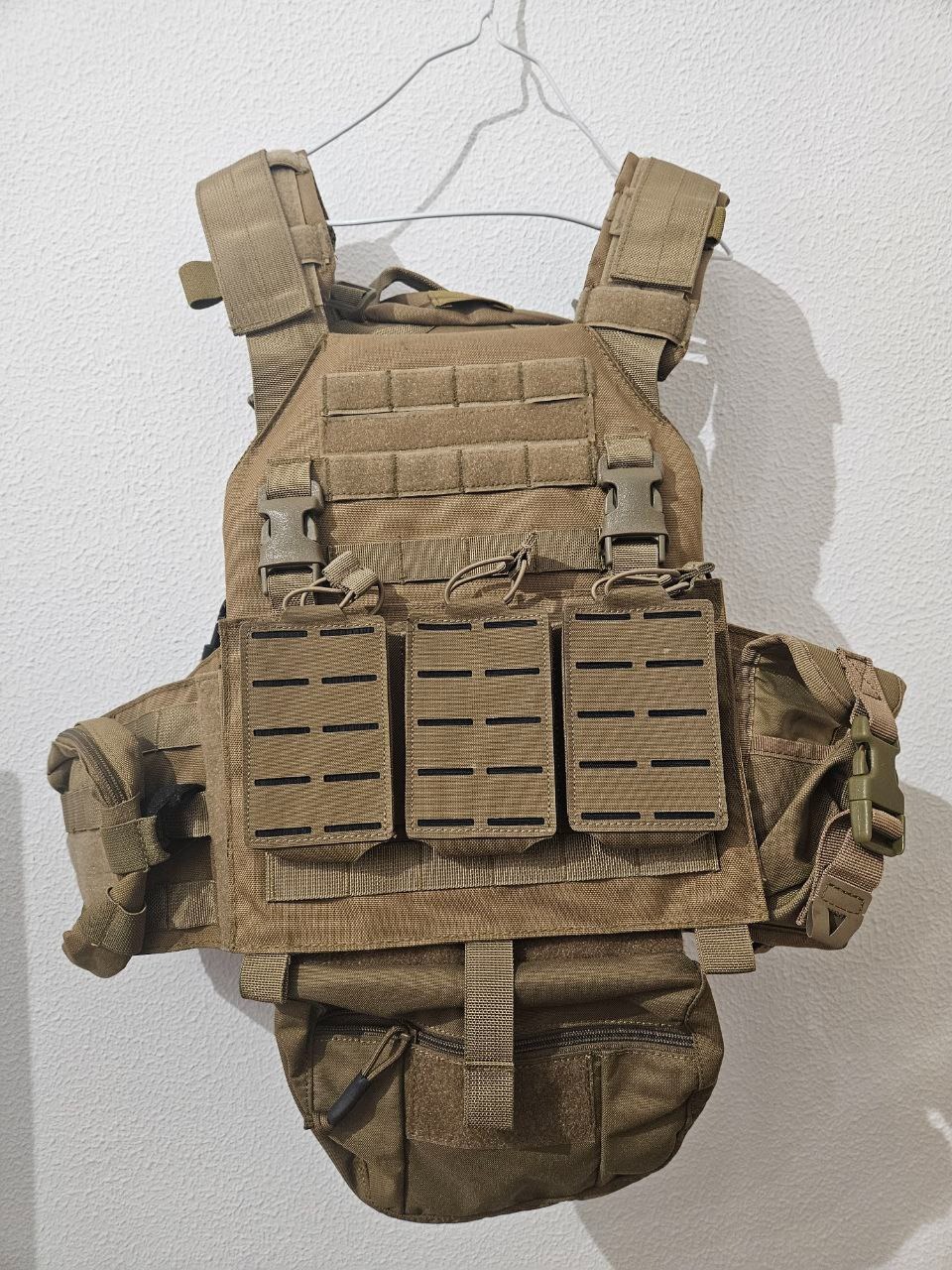 Chaleco táctico tipo Plate Carrier color coyote, ideal para airsoft, milsim o entrenamiento táctico.