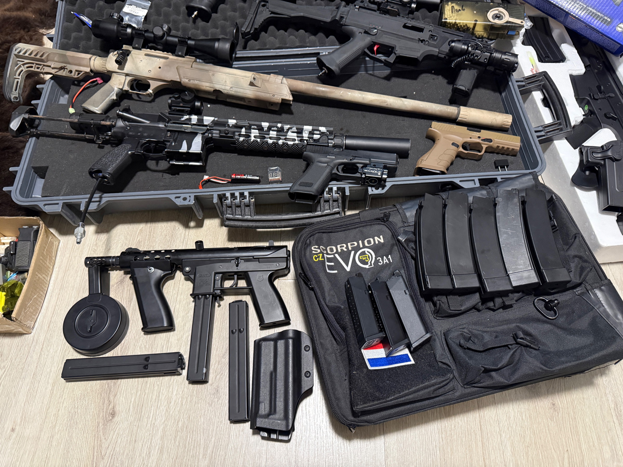 - upgraded Scorpion evo hpaΒ incl tas 5 mags maxx hopup , speedtrigger reddot flashlight met pressureplate etc