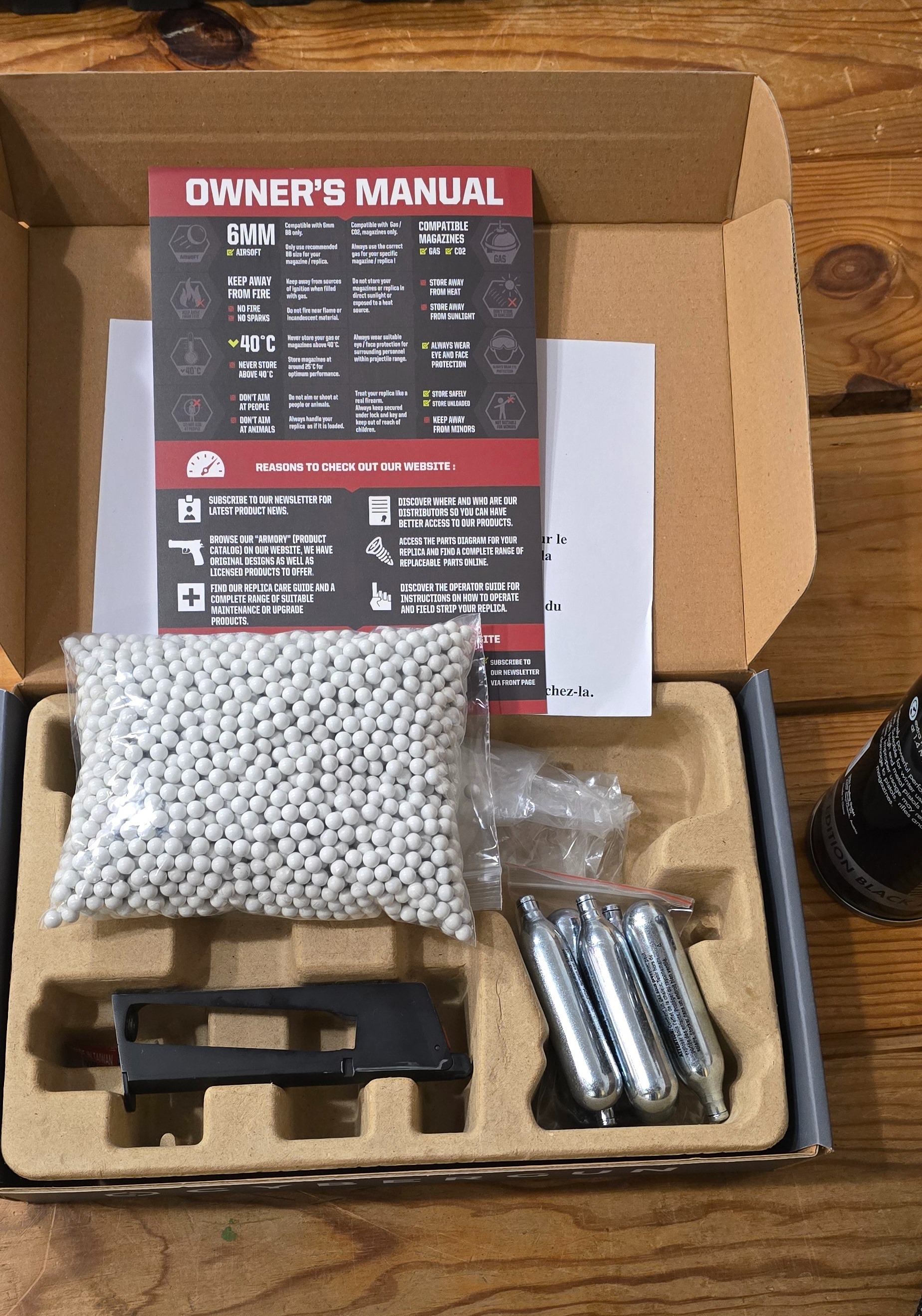 Deze replica is geheel van metaal en heeft houten grepen. De originele plastic grepen en nog een setje donker hout, zitten er bij. Komt met twee magazijnen voor GBB en één magazijn voor CO2.