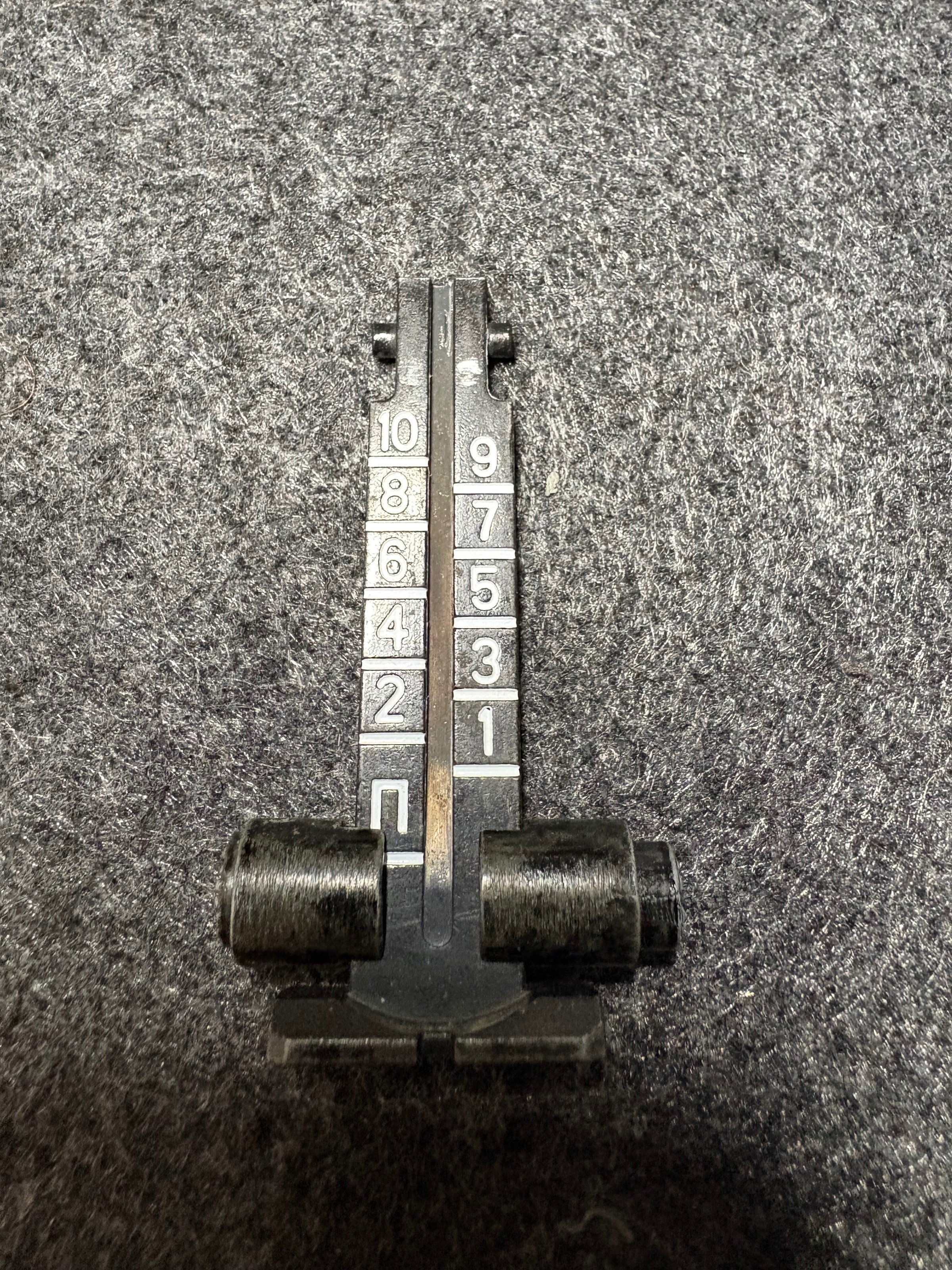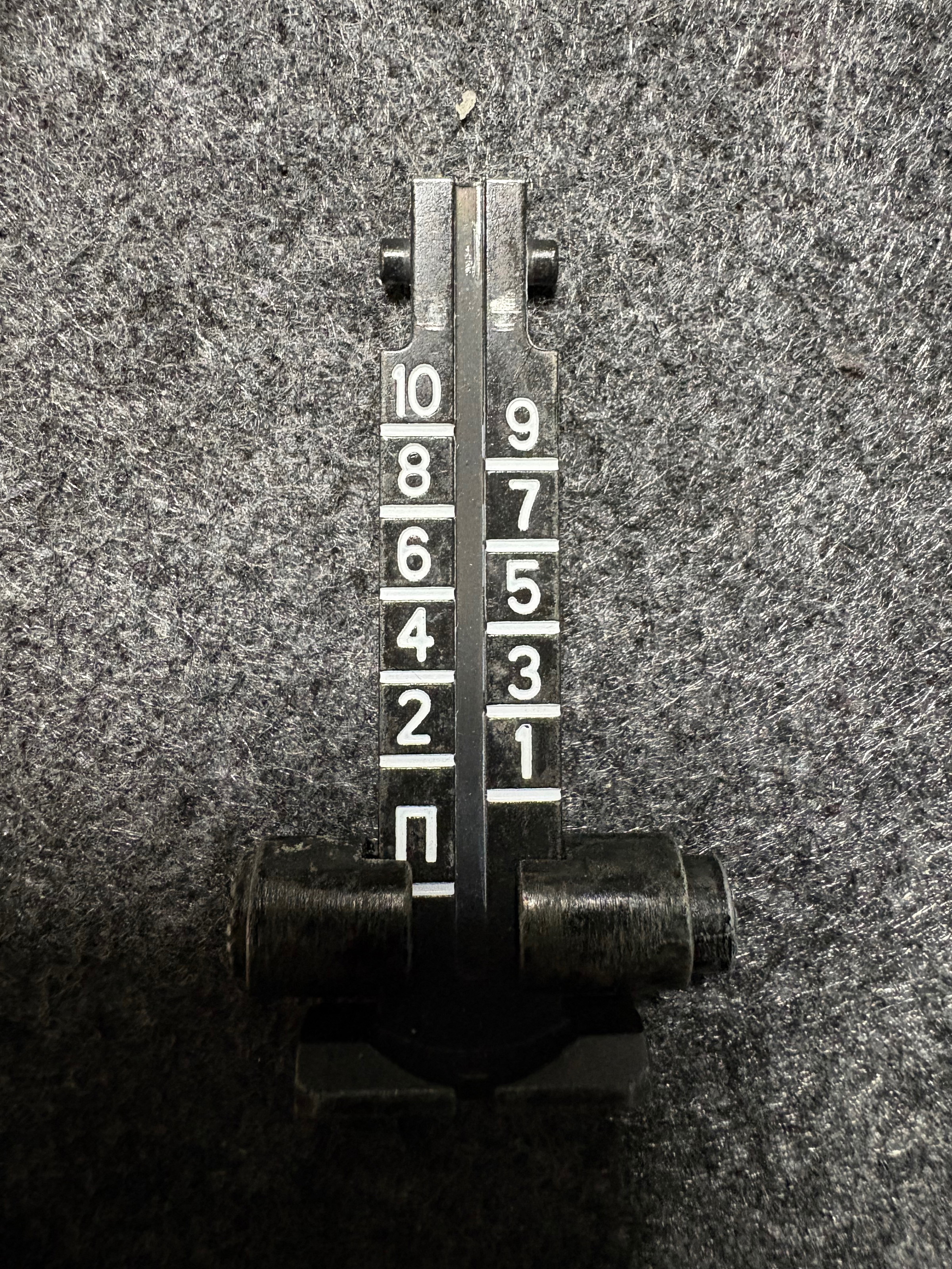Dit is het standaard militaire tangent vizier dat op vrijwel alle AK-platformen wordt gebruikt. De schaalverdeling loopt van 1 t/m 10 en staat voor afstanden van 100 tot 1000 meter, zoals bedoeld in het originele Kalashnikov ontwerp.